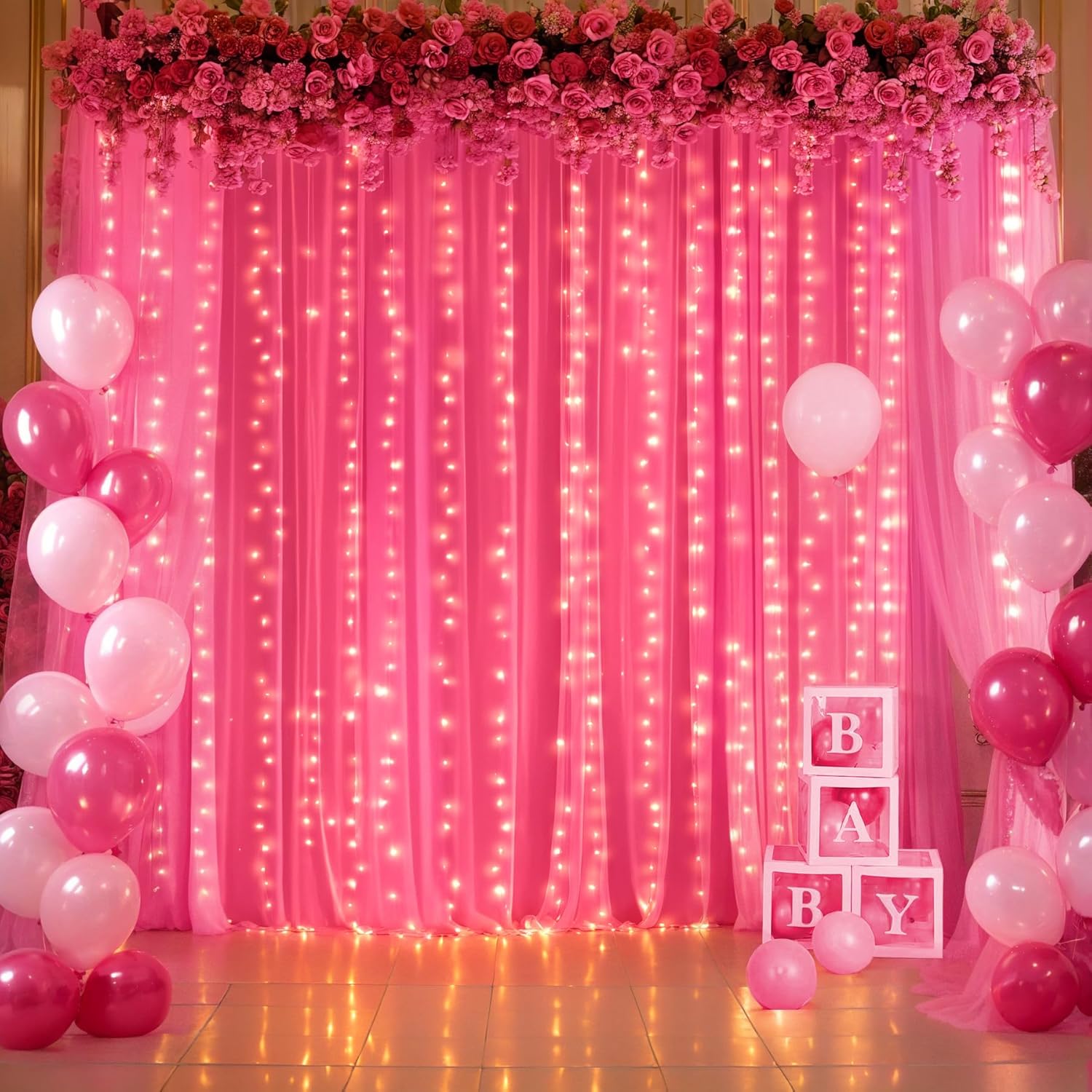 - Products include: 10ft × 8ft hot pink sheer tulle backdrop curtain, a set of 9.8ft warm white string light and 12pcs Transparent clips (no remote control).