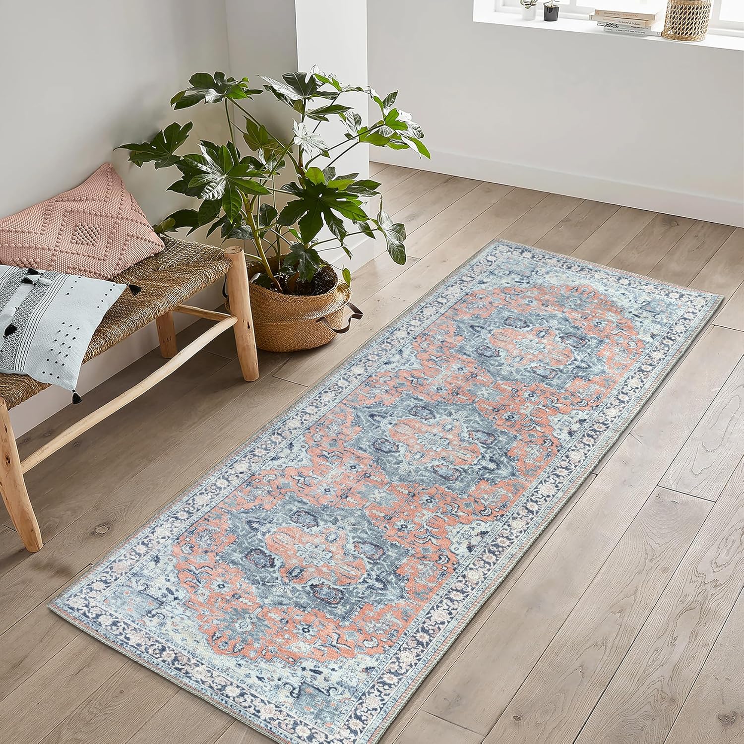Bloom Rugs Washable Non-Slip 7 ft Runner - Coral/Blue Traditional Medallion Runner for Entryway, Hallway, Bathroom, and Kitchen - Exact Size: 2.5' x 7'
