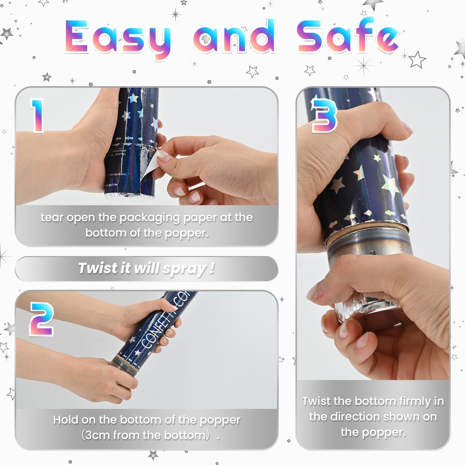 - 【Silver Party Poppers】Safety is our top priority. Our confetti cannon kit is non-toxic, and made with foil confetti papers.With a simple twist of the bottom confetti poppers spray shiny silver star shaped confetti in15-25ft high. Create surprising, marvelous, and exciting effects with party poppers for birthdays, new year's eve party, graduation, festivals, and special announcements.