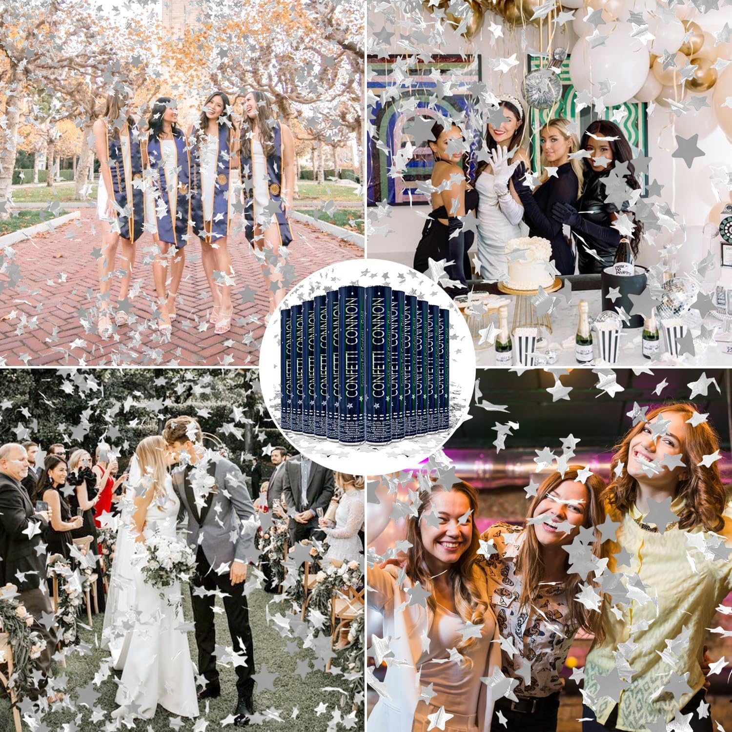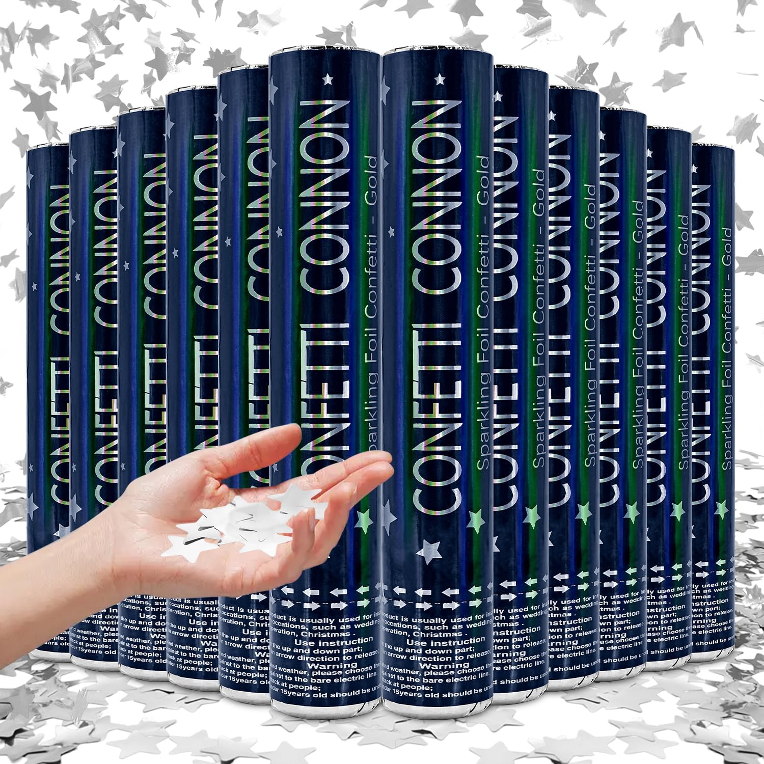 - 【Perfect Party Cannon】Confetti poppers for celebration are gorgeous in the air, reflecting sunlight or lights will become more shiny. 12Pack confetti cannon is suitable for any occasion to extraordinary heights, star confetti with metallic texture in glitter silver color, will add joy and cheer to your wedding, parties birthday graduation Christmas to New Year's Eve.