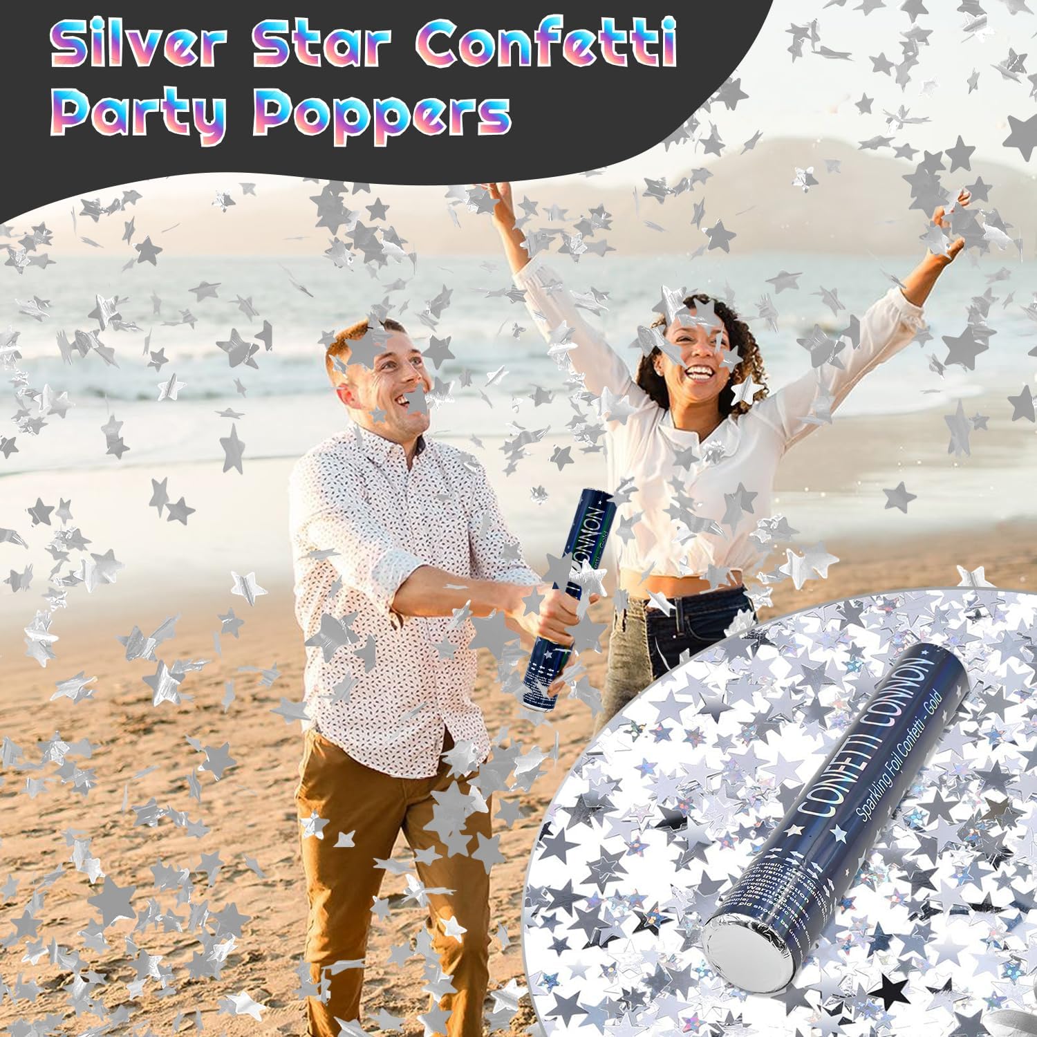 - 【12Pack Confetti Poppers】Confetti cannon silver 12pack come with lovely and delicate star sequin confetti. Dazzle your guests with the breathtaking spectacle of swirling stars as they cascade from our elegant cannons. Our confetti poppers aren't just practical; they're works of art, designed to captivate and enchant.