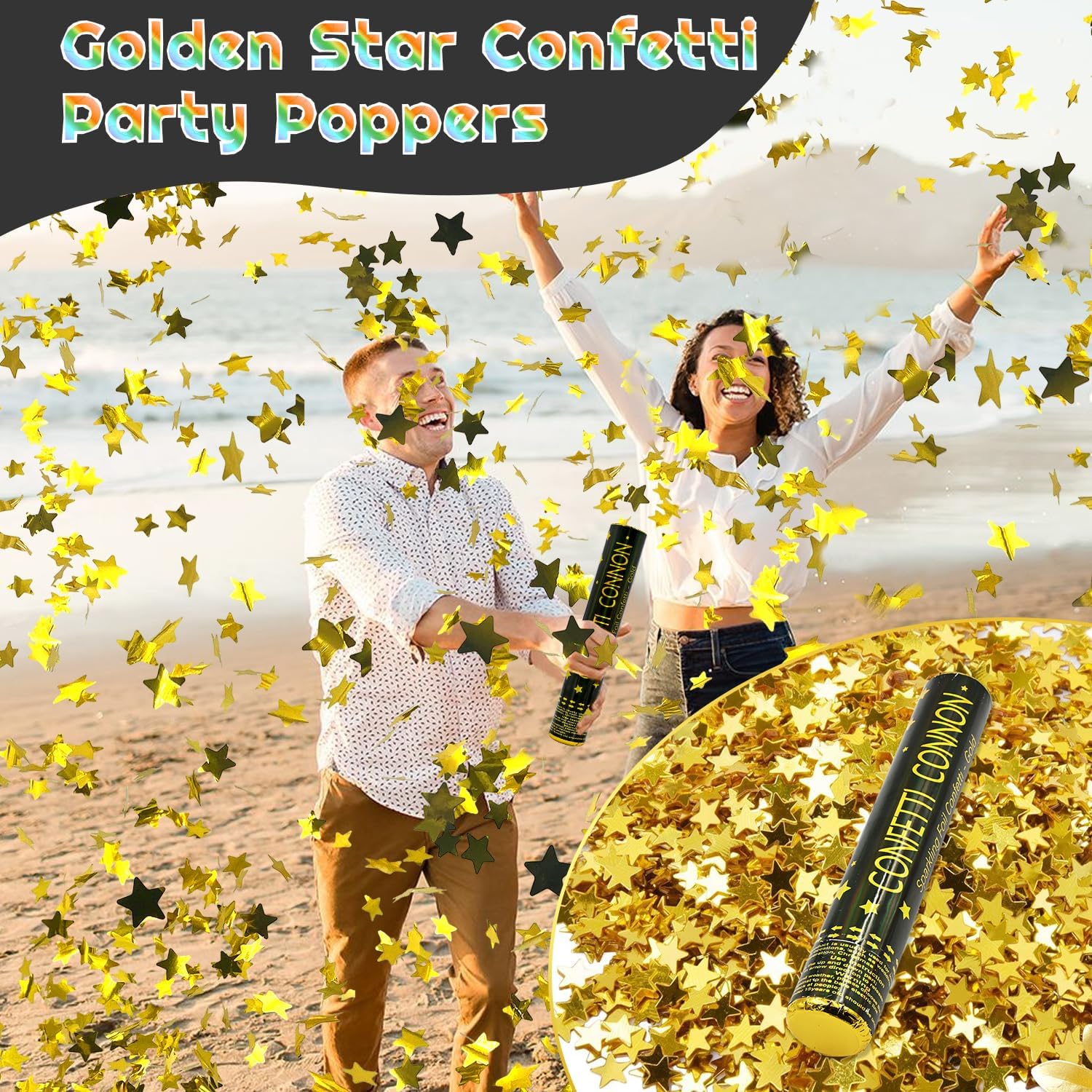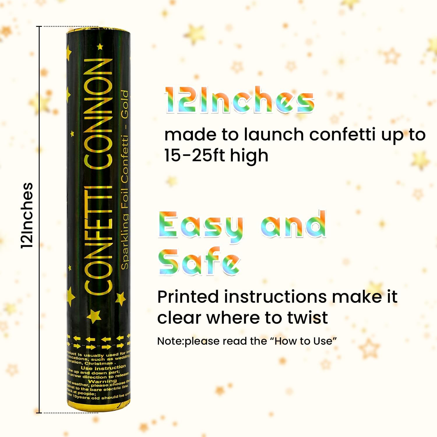 - 【Safe To Use Party Poppers】Safety is our top priority. Our confetti cannon kit is non-toxic, and made with foil confetti papers.With a simple twist of the bottom confetti poppers spray shiny gold star shaped confetti in15-25ft high. Create surprising, marvelous, and exciting effects with party poppers for birthdays, new year's eve party, graduation, festivals, and special announcements.