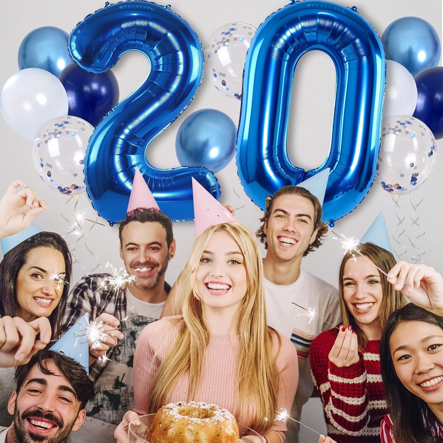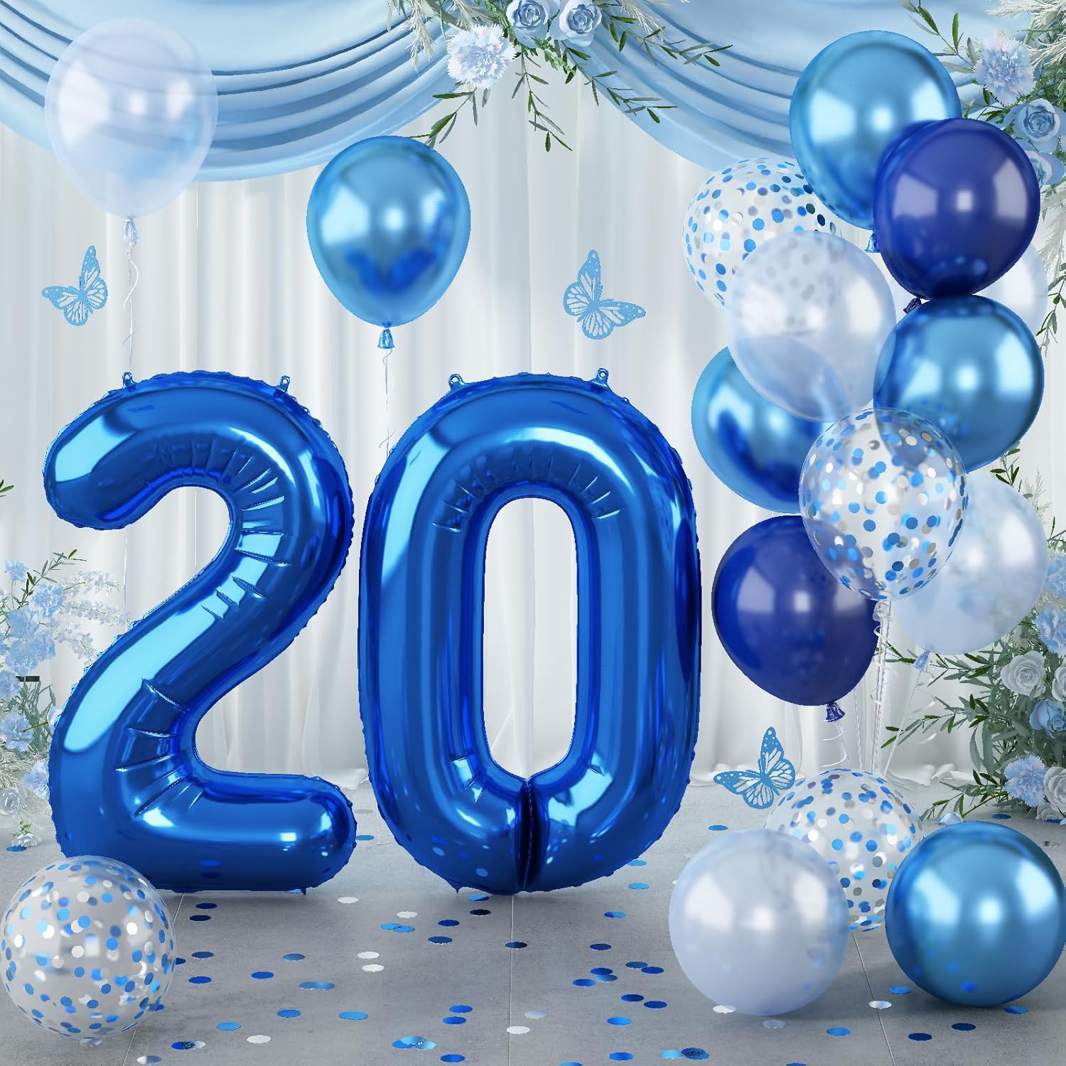 - 💓 Dark Blue Number 20 Balloon: Our package included 40 inch foil number 20 balloon(2pcs), 12 inch metallic blue balloon(4pcs), blue silver confetti balloon(4pcs), pastel blue balloon(4pcs), Light Navy Blue Balloon(2pcs), 1pcs straw and 1 roll ribbon. Simply inflate the balloon using the straw, and you're ready to party! Navy blue number foil balloons are the best for men or women birthday party decoration.