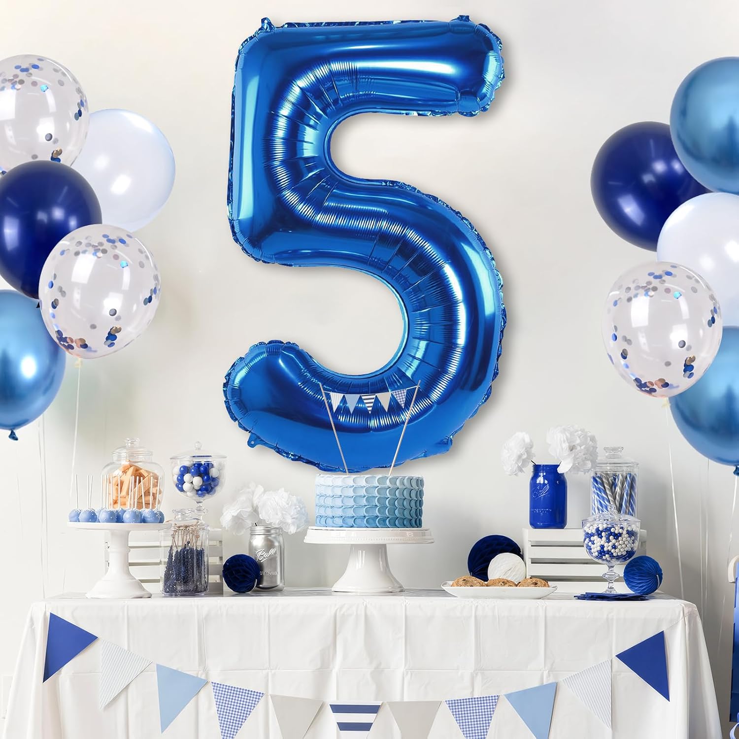 - 💓 Dark Blue Number 5 Balloon: Our package included 40 inch foil number 5 balloon(1pcs), 12 inch metallic blue balloon(4pcs), blue silver confetti balloon(4pcs), pastel blue balloon(4pcs), Light Navy Blue Balloon(2pcs), 1pcs straw and 1 roll ribbon. Simply inflate the balloon using the straw, and you're ready to party! Navy blue number foil balloons are the best for girls or boys birthday party decoration.