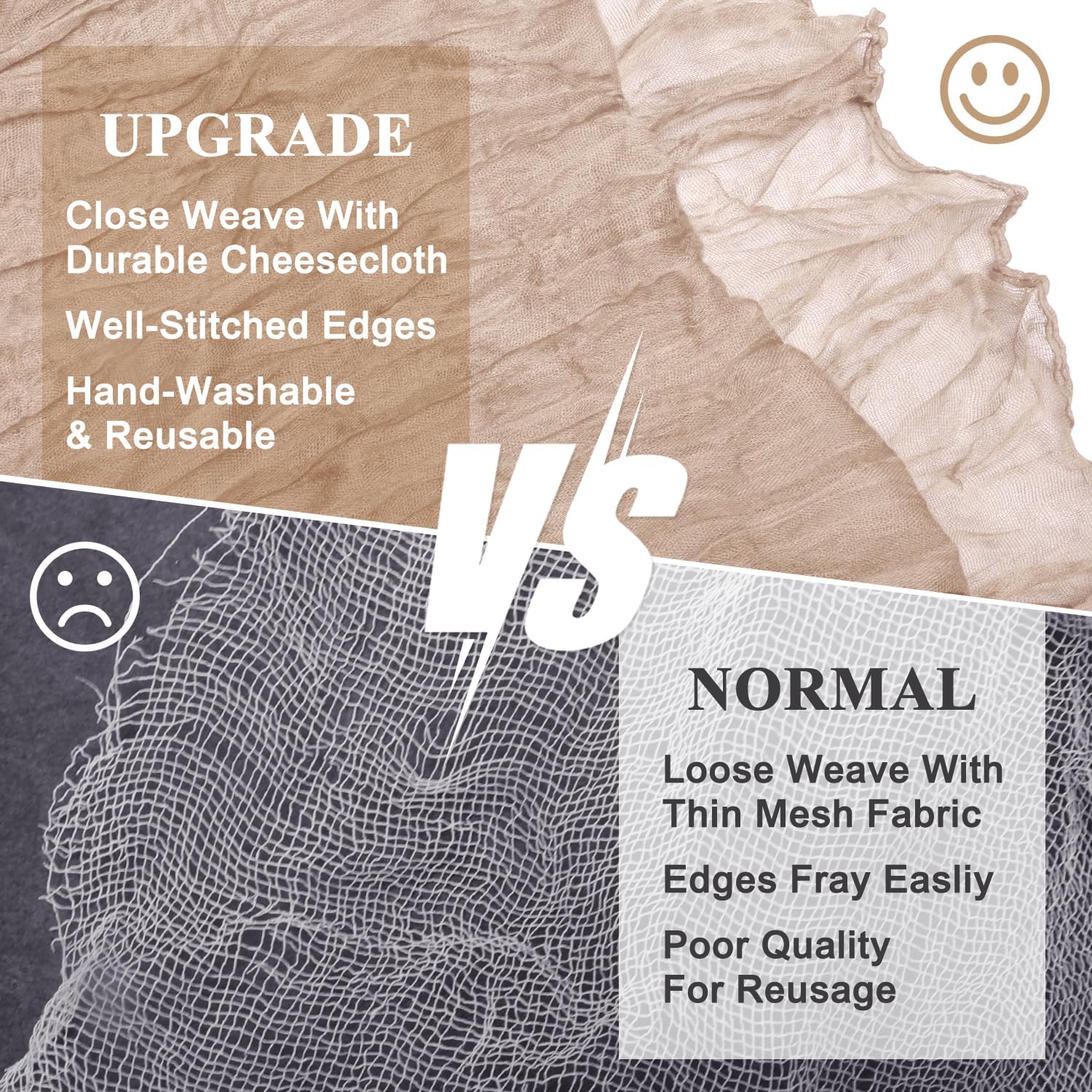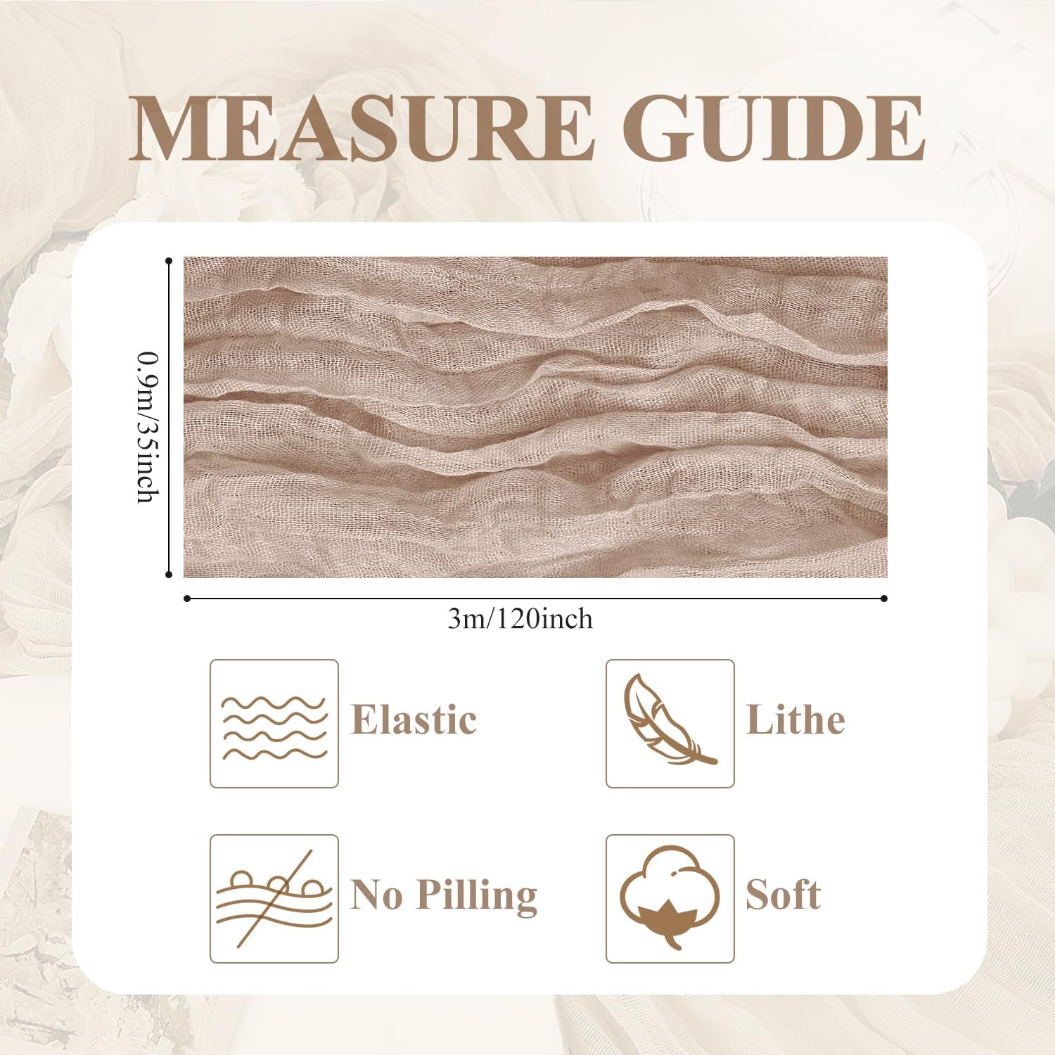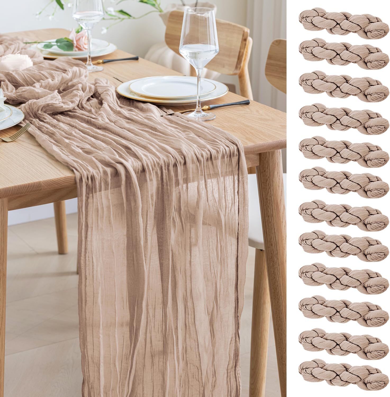 - 【Cheesecloth Table Runner】 Size: 35" W x 120" L. You will get 12 pieces 10FT length cheesecloth table runner. The sheer rustic table runner is long enough to span a large table and drape gracefully across the table. It will gently sway in the wind, adding a romantic atmosphere to your occasion. These eye-catching gauze table runners are ideal for arranging an elegant, stylish tablescape.