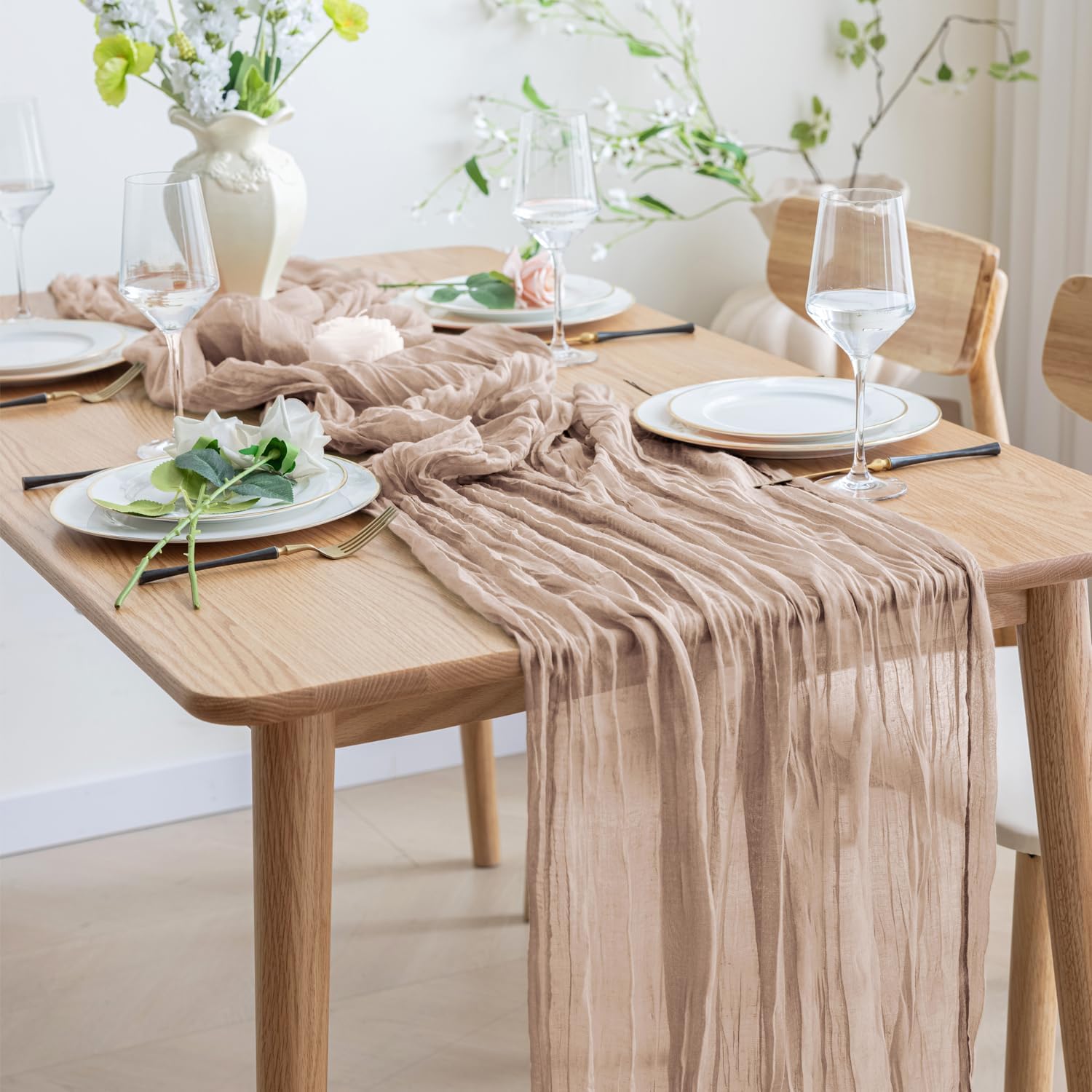 - 【Cheesecloth Table Runner】 Size: 35" W x 120" L. You will get 2 pieces 10FT length cheesecloth table runner. The sheer rustic table runner is long enough to span a large table and drape gracefully across the table. It will gently sway in the wind, adding a romantic atmosphere to your occasion. These eye-catching gauze table runners are ideal for arranging an elegant, stylish tablescape.