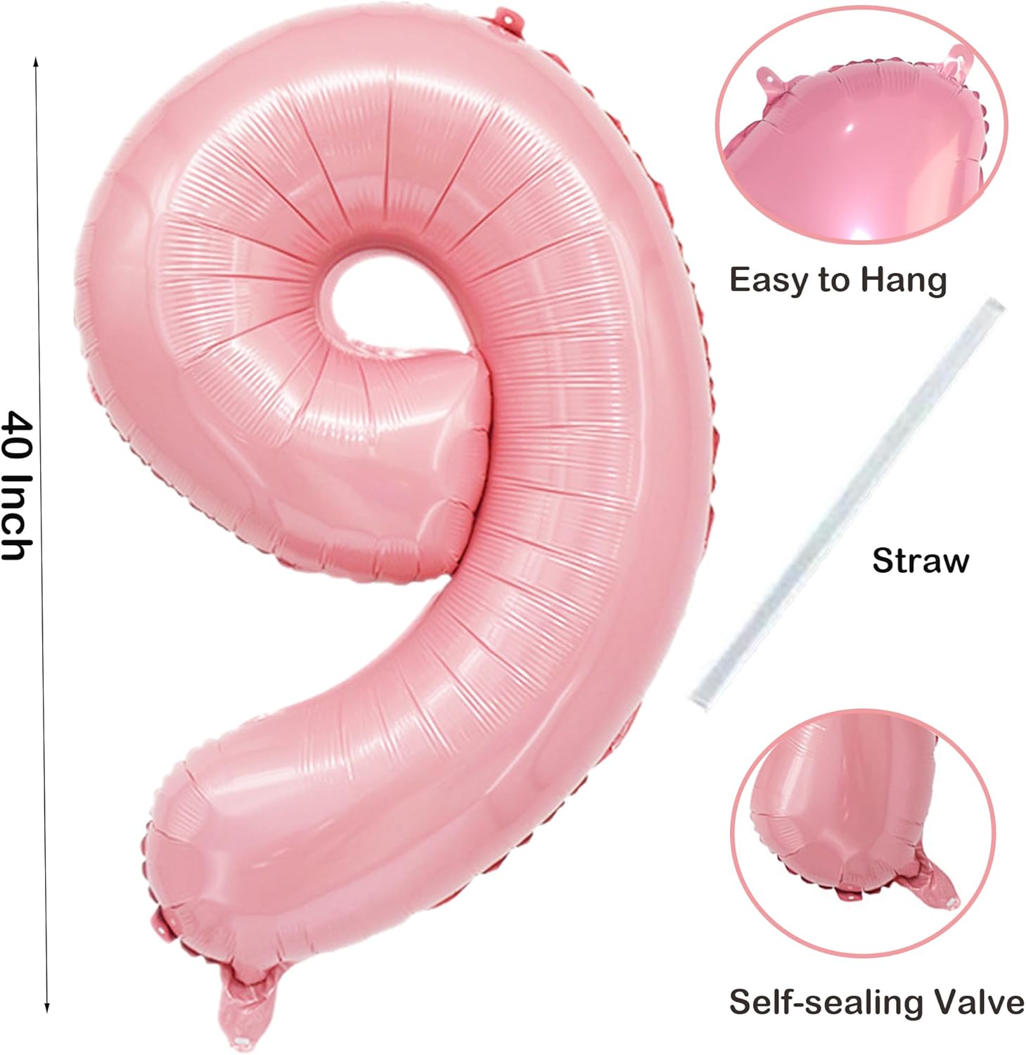 - 【Reusable 】: Light pink number 9 balloon can be reusable repeatedly with self-sealing valve, convenient to inflate and deflate by an air. After party ending, the number balloons will easy to deflate and store for next time use. Do not overfill the balloon to avoid sunburn, overheating, sharp objects and excessive friction.