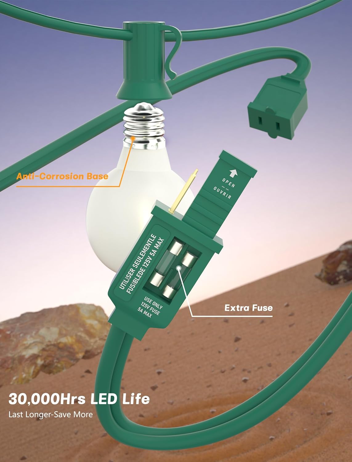 - End-to-end Connection: The G40 LED Christmas lights features an end-to-end connection design that can connect up to 28 strands to cover a large area. The Christmas lights outdoor can withstand extreme temperatures, rain, wind or wet weather. Unlike traditional ropes, they can be used indoors and outdoors for years