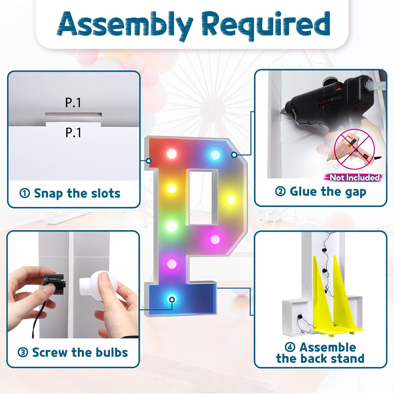 - Assembly Required. To assemble the light up numbers and letters, a hot glue gun is necessary. We have conveniently pre-cut the numbers into several pieces for your convenience. Simply consult the included instruction manual to easily assemble the impressive 4 ft tall and 3ft tall marquee numbers and letters using a hot glue gun.