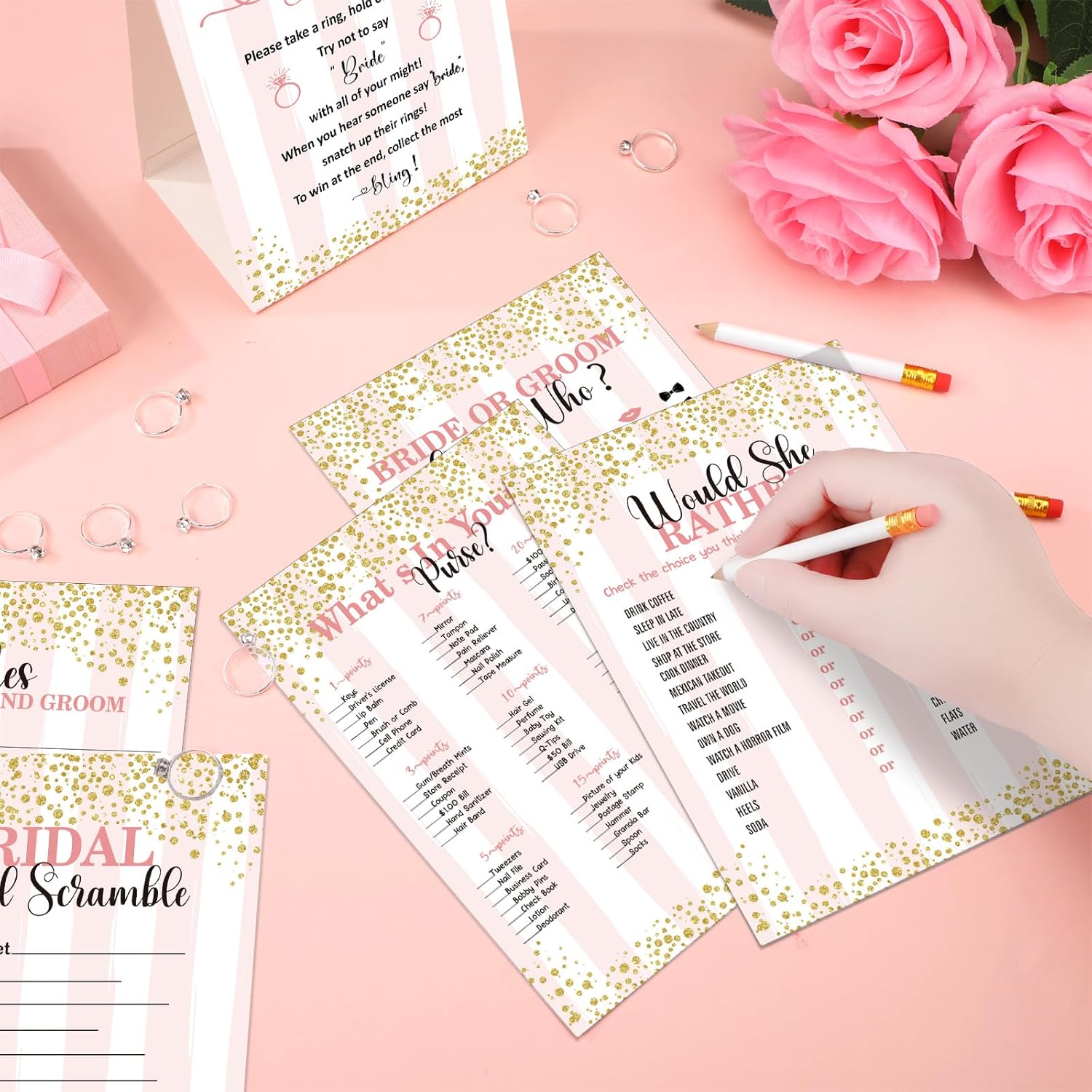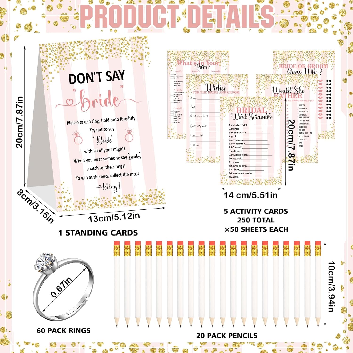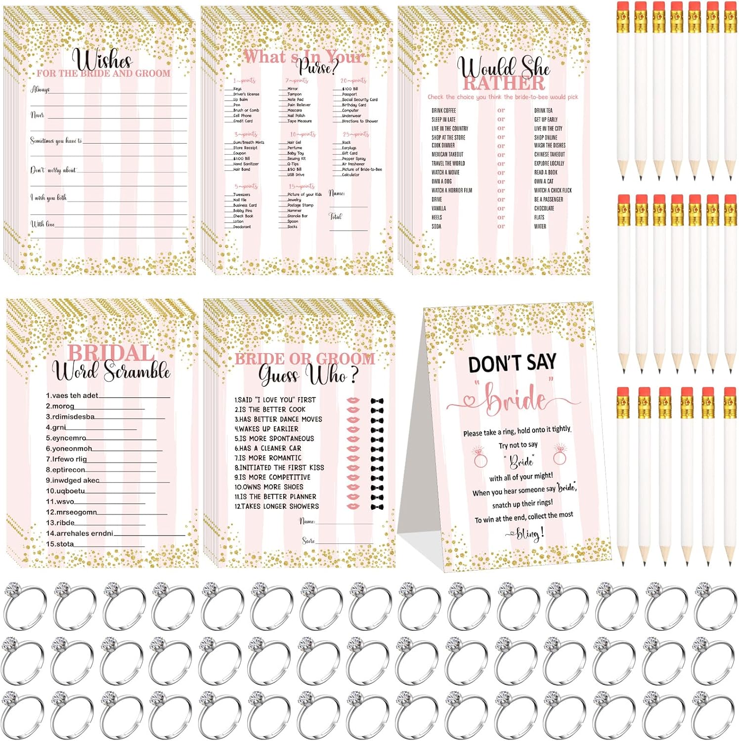 - Funny Bridal Shower Games: you will be provided with 250 pieces of gold confetti themed wedding games cards, 1 piece of wedding sign, 60 pieces of rings and 20 pieces of pencils, sufficient quantities can entertain your families and guests in bridal shower