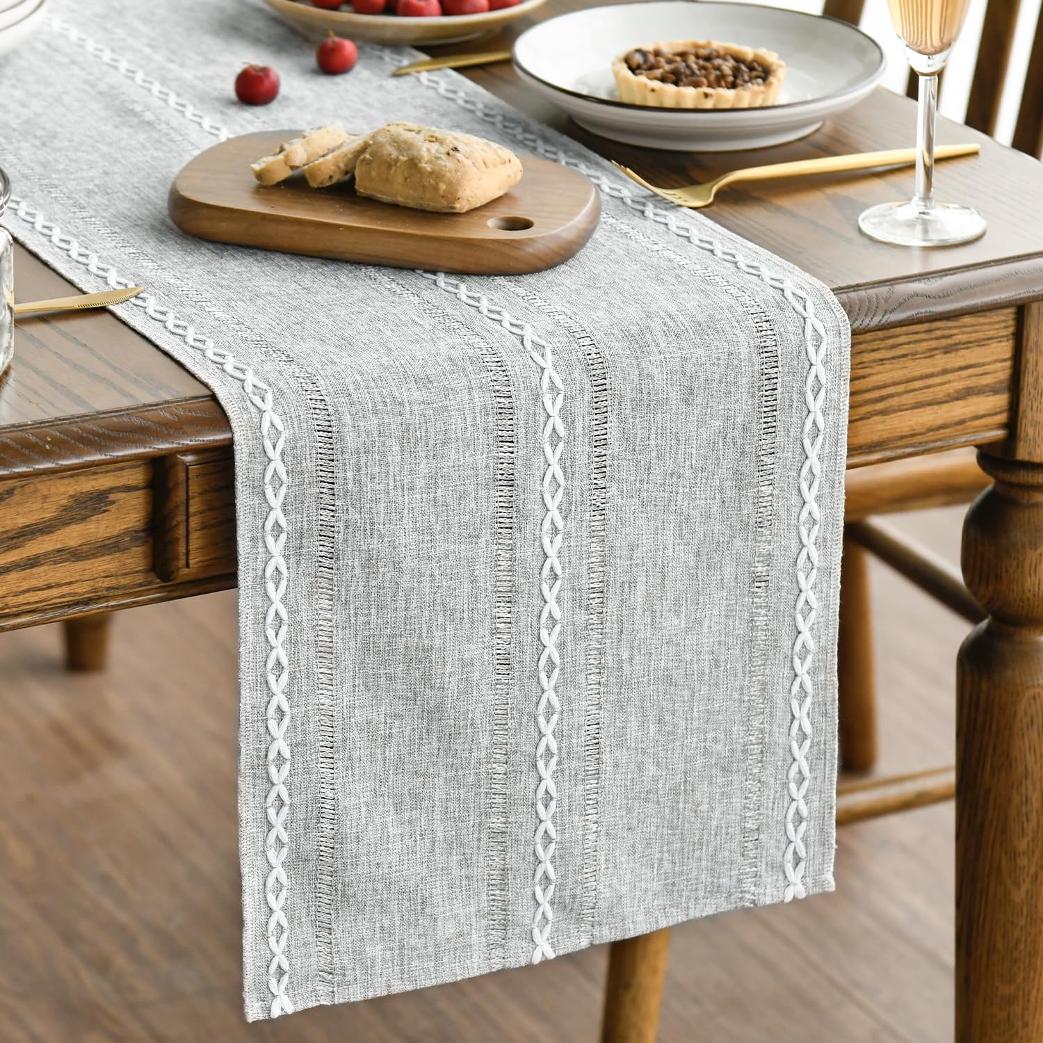 Artoid Mode Grey Rustic Cotton Linen Table Runner, Seasonal Embroidered Hollow Kitchen Dining Table Decoration for Home Party Decor 13x108 Inch