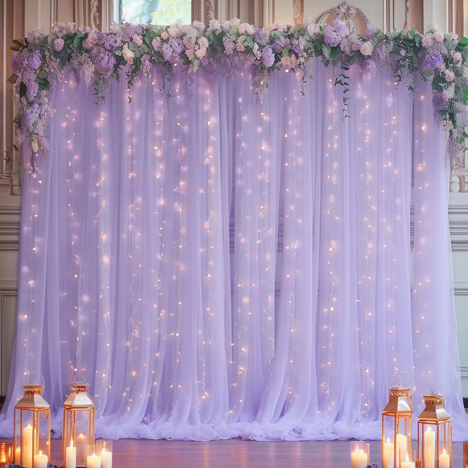 10x10ft Purple Tulle Backdrop Curtain with Lights String for Parites, Sheer Photo Backdrop Curtains with Lights for Wedding Backdrop Ceremony Reception Bridal Shower Baby Shower Birthday Party