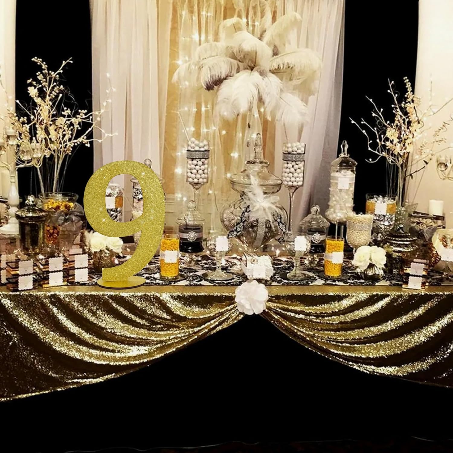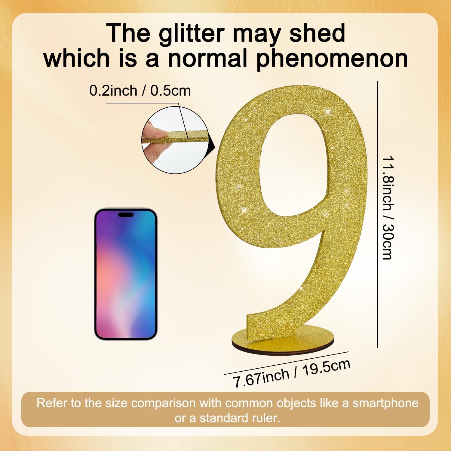 - Item Information: 1*9 gold glitter number ornament. Size: 30*20*0.3 CM (11.8 * 7.9 * 0.12 Inch)