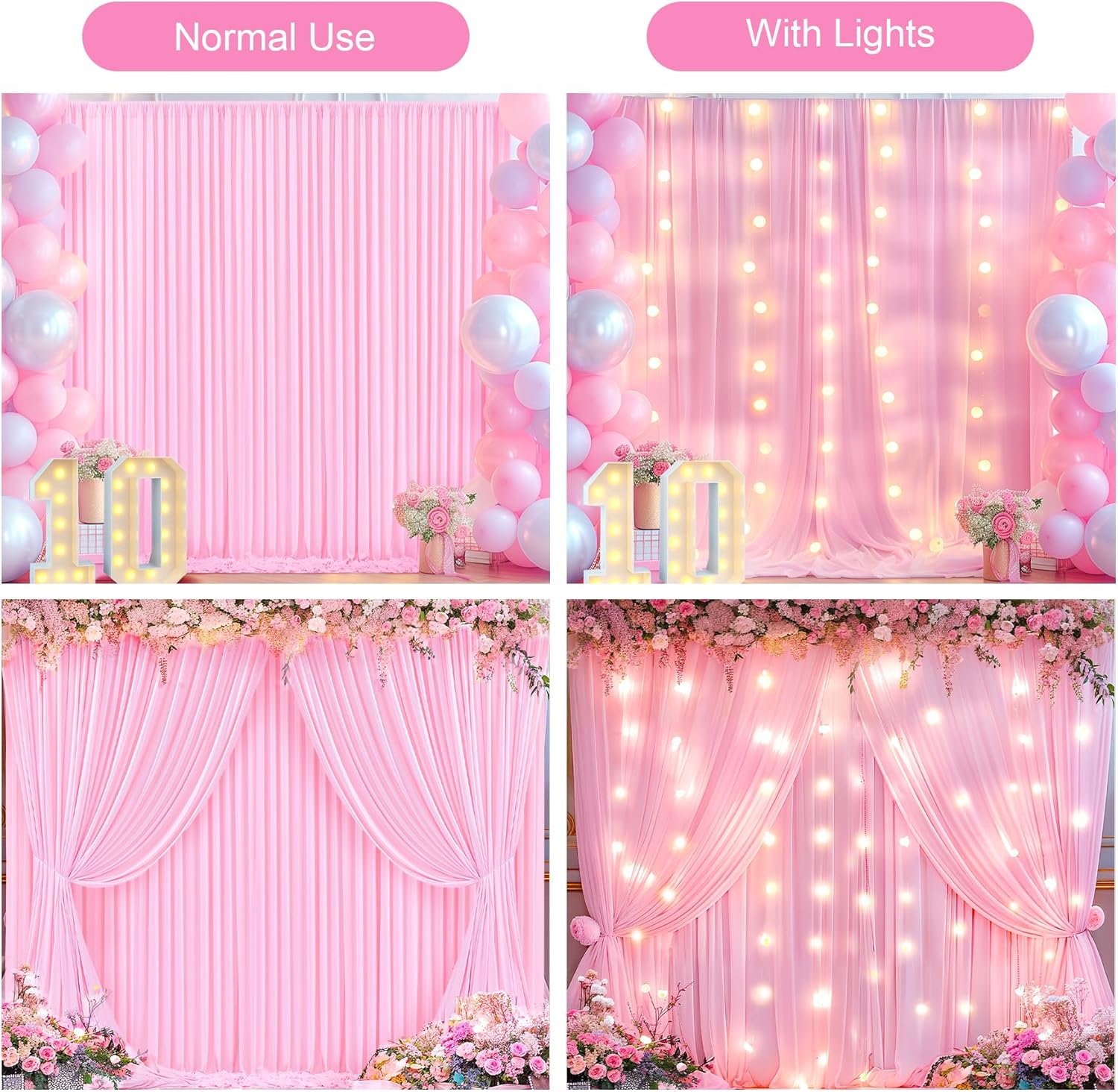 - 【Pink Backdrop Curtains with Lights for Parties】- Our white backdrop curtain can be used indoors and outdoors, they are perfect for baby shower, birthday party, wedding, graduation ceremony, dessert tables, anniversary, New Year's Eve party, stages photography or any other important events. It is also a good choice to use this white backdrop curtains for photoshoot.