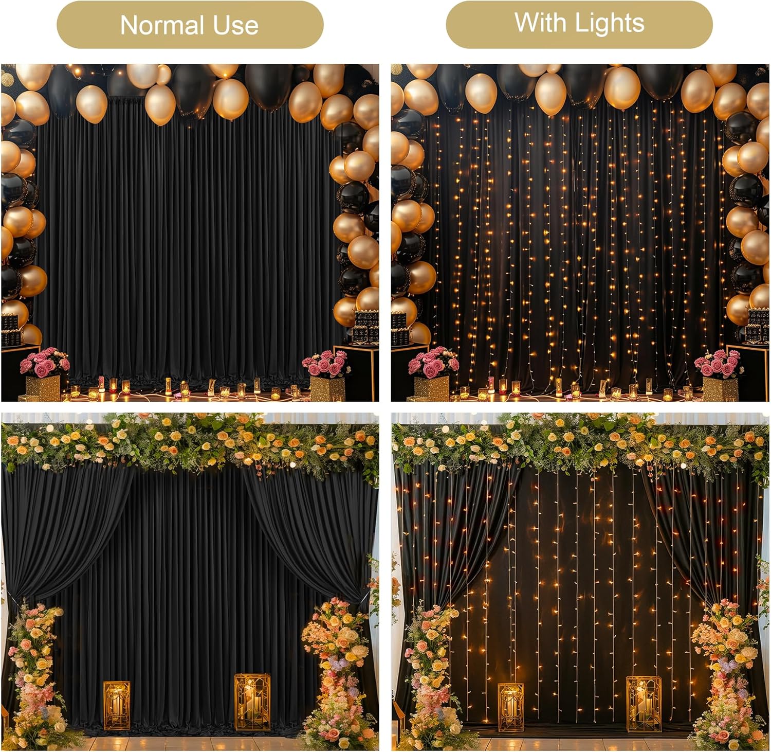 - 【Black Backdrop Curtains with Lights for Parties】- Our black drapes for backdrop can be used indoors and outdoors, they are perfect for baby shower, birthday party, wedding, graduation ceremony, dessert tables, anniversary, New Year's Eve party, stages photography or any other important events. It is also a good choice to use this white backdrop curtains for photoshoot.