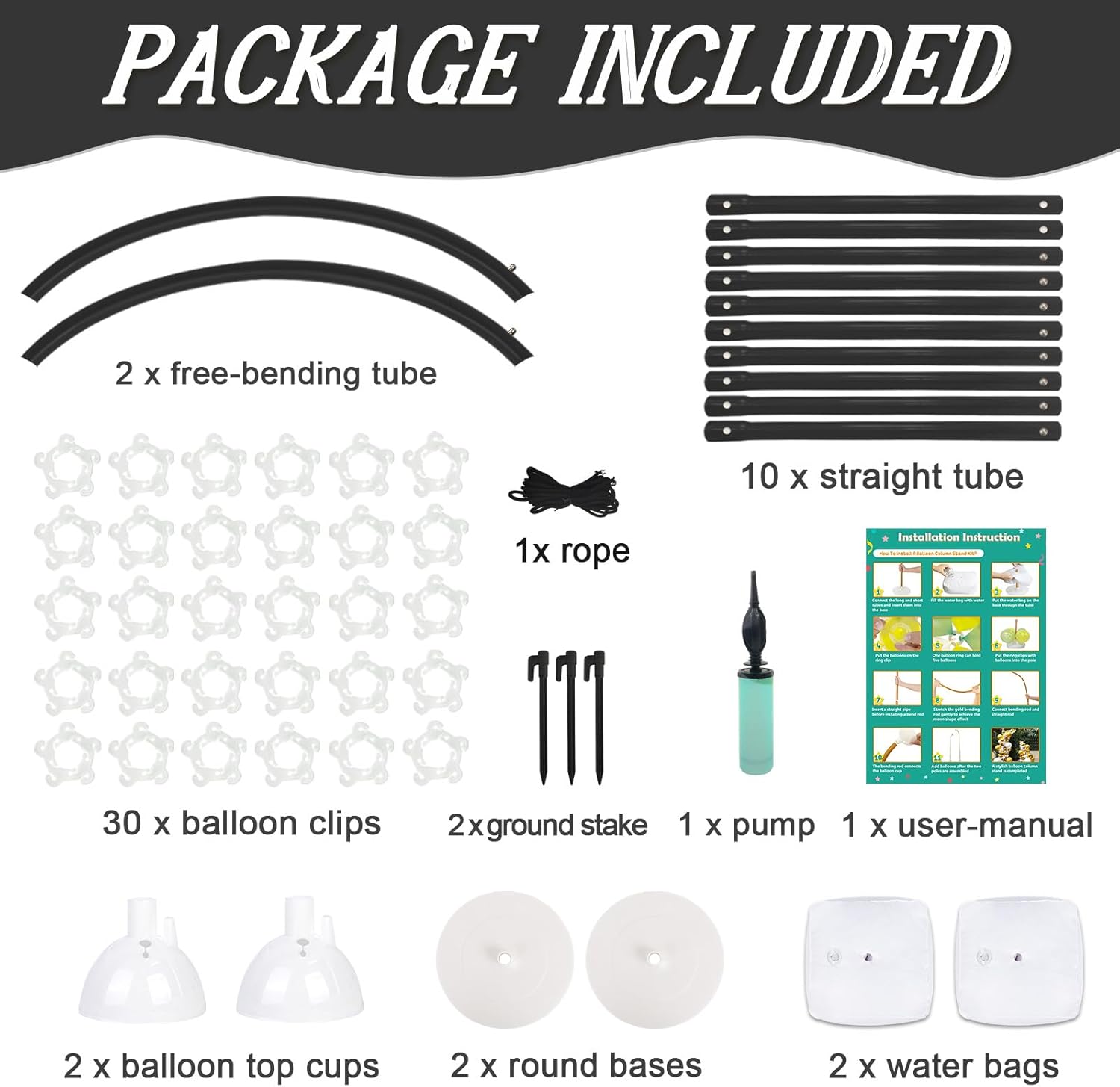 - Included Components : 10 straight tubes, 2 free-bending top tubes, 2 balloon top cups, 2 round bases, 2 water bags, 30 balloon clips, 1 pump, 1 tether, 3 ground stakes and a user manual (balloons not included). 10 straight tubes, 2 free-bending top tubes, 2 balloon top cups, 2 round bases, 2 water bags, 30 balloon clips, 1 pump, 1 t… See more
