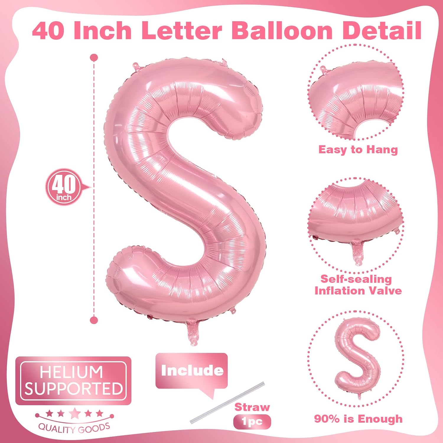 Self Inflating Pastel Pink S Letter Balloon, 40 Inch Large Alphabet Foil Custom Letter Balloon for Girls Birthday Party & Baby Shower Decoration