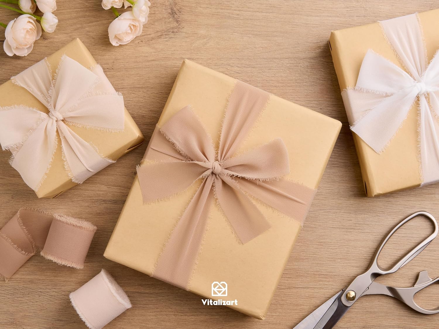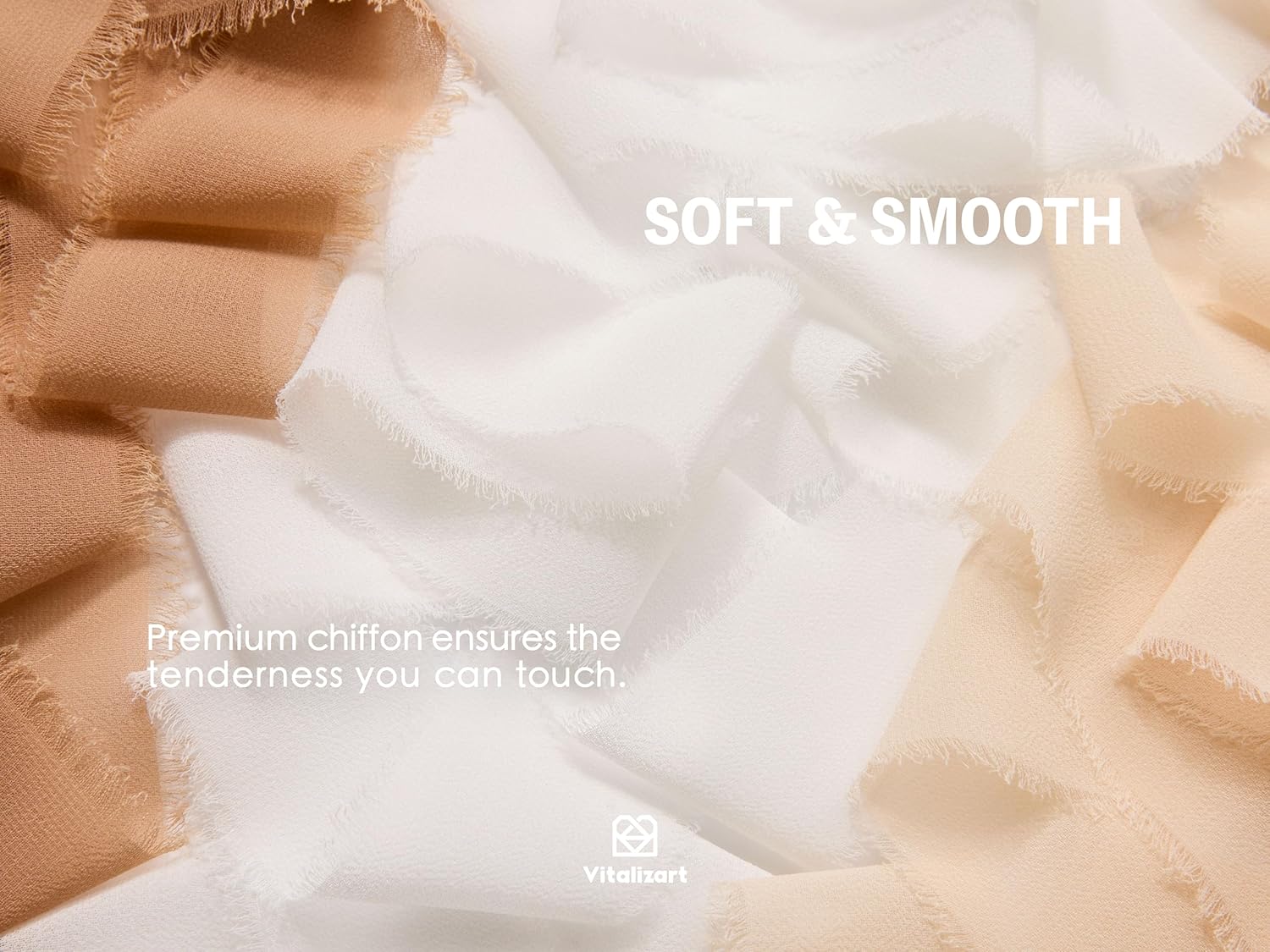 Vitalizart Handmade Chiffon Silk Ribbon Fringe 1.5" x 21 Yd White & Camel Frayed Edges Ribbons for Wedding Invitations Bridal Bouquets Gifts Wrapping Crafts Holiday Party Decorations