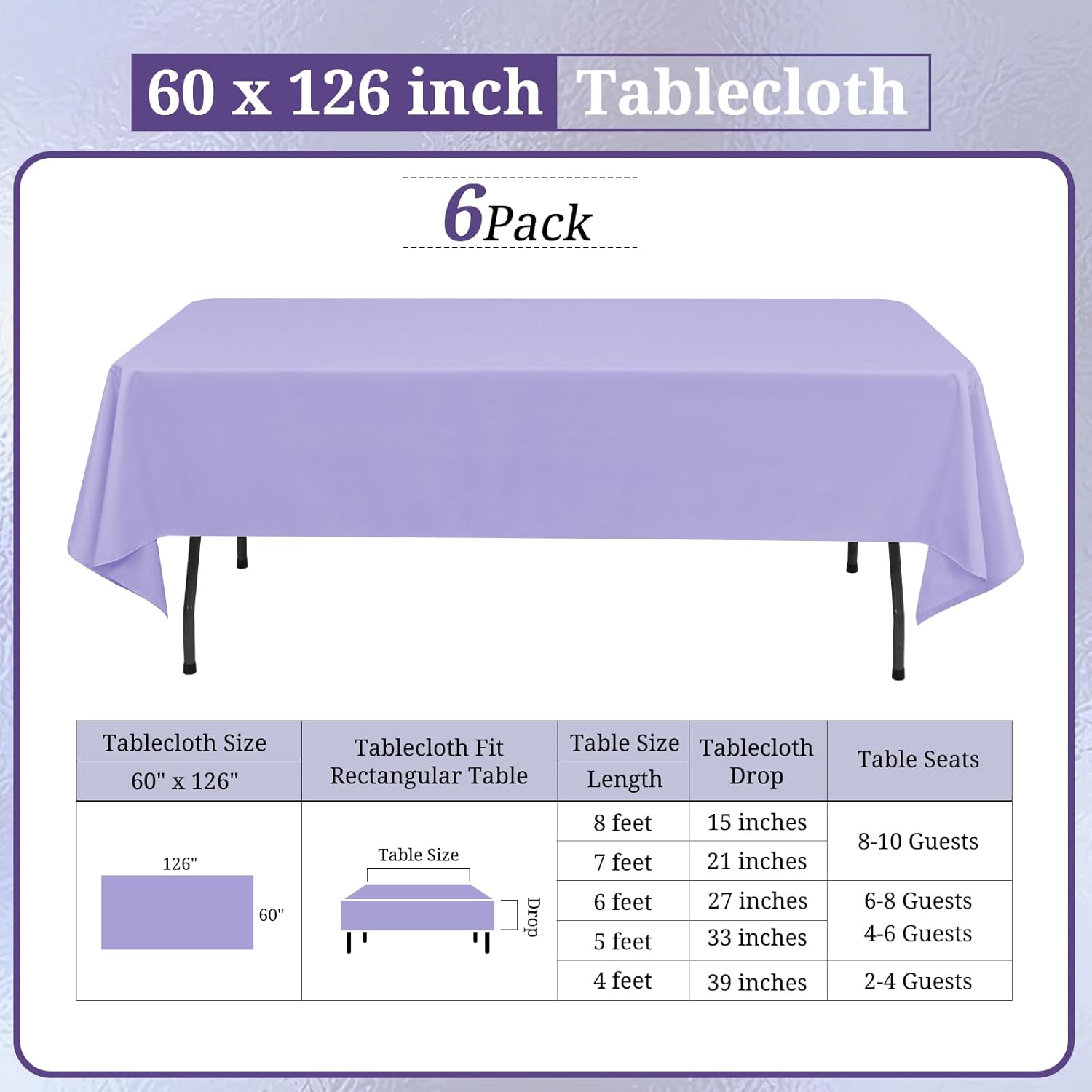 - 【Perfect size】This lavender table cloth is 60 inch wide and 126 inch long, cut entirely from a single piece of fabric, perfect for standard 8ft table, providing 15 inch drop. Lavender tablecover is more luxurious, classic and gracious, ideal for both formal & casual settings and makes a great gift for all occasions.Upgrade your special moment and daily life with an exquisite taste.