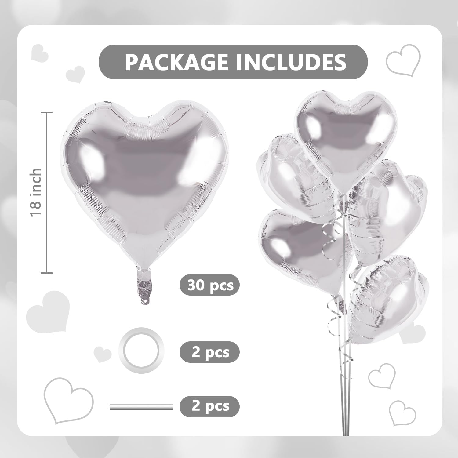 TONIFUL 30Pcs 18 Inch Silver Heart Balloons Silver Heart Shape Foil Mylar Balloons Decoration for Birthday Valentine's Day Wedding Bridal Shower Anniversary Engagement Party Supplies