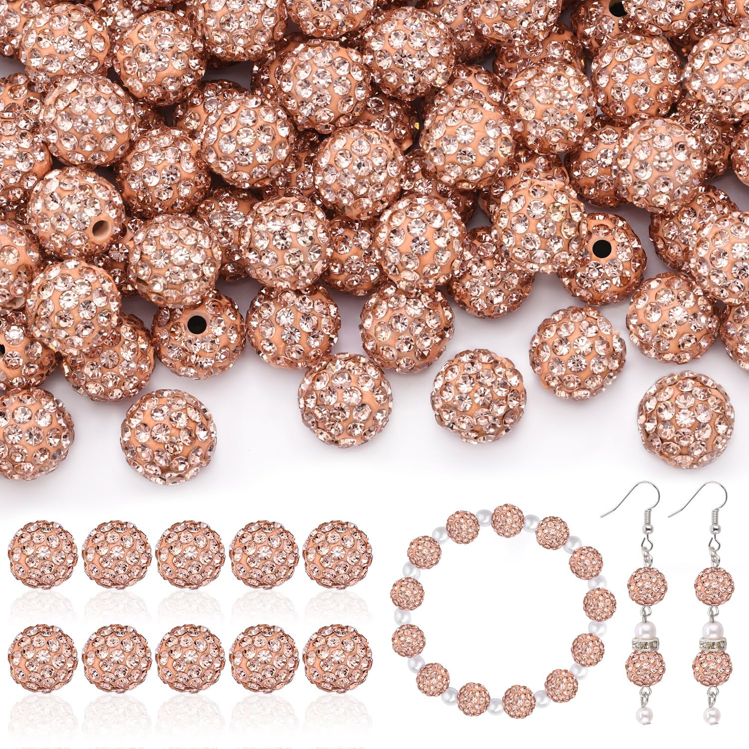 200pcs 10mm Rhinestone Beads for Jewelry Making, Light Peach Shiny Round Disco Ball Beads Bulk, Sparkle Crystal Clay Christmas for Bracelet Baseball Necklace Earring Crafting and DIY