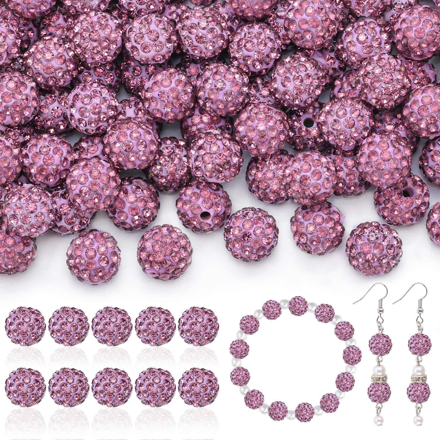 200pcs 10mm Rhinestone Beads for Jewelry Making, Light Purple Shiny Round Disco Beads Bulk, Sparkle Crystal Clay Christmas for Bracelet Baseball Necklace Earring Crafting and DIY