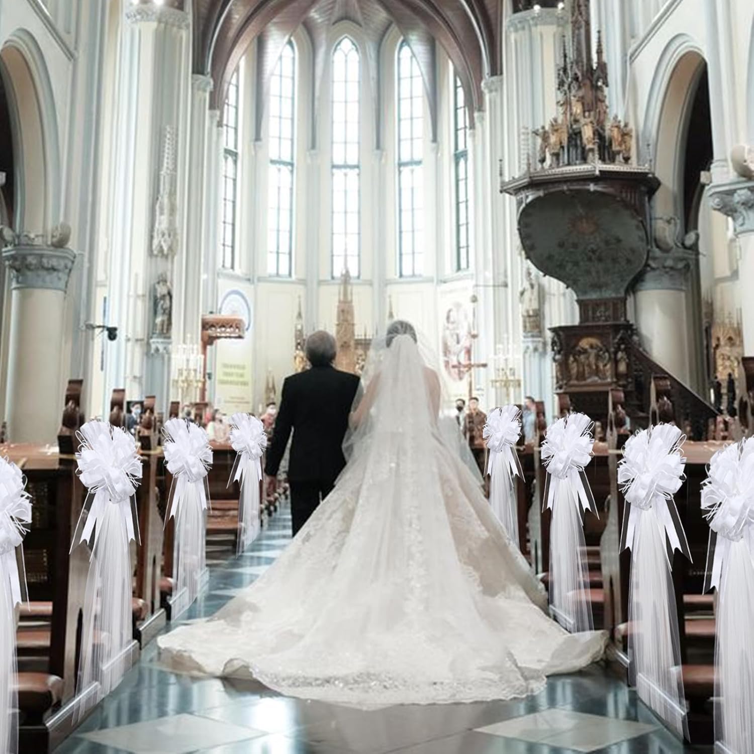 - Wedding Pew Bows Tulle Set: there are 30 white tulle straps, and 30 tulle bow ties, allowing you to make 30 sets of large white wedding pull bows with long tulle tails, which is ideal for enhancing the visual appeal of your wedding aisles, gift items or wedding decorations; This tremendous pack manifests an exquisite blend of style and quantity to make your wedding a memorable affair
