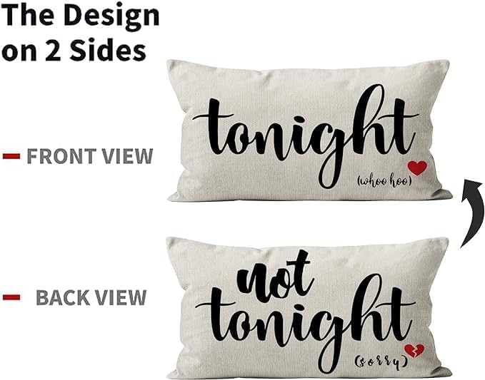 - Dual-sided Design: Enjoy the versatility of two charming patterns – "Tonight" and "Not Tonight." Playfully set the mood by flipping the pillow to match your desires, adding a touch of fun to your bedroom or sofa.