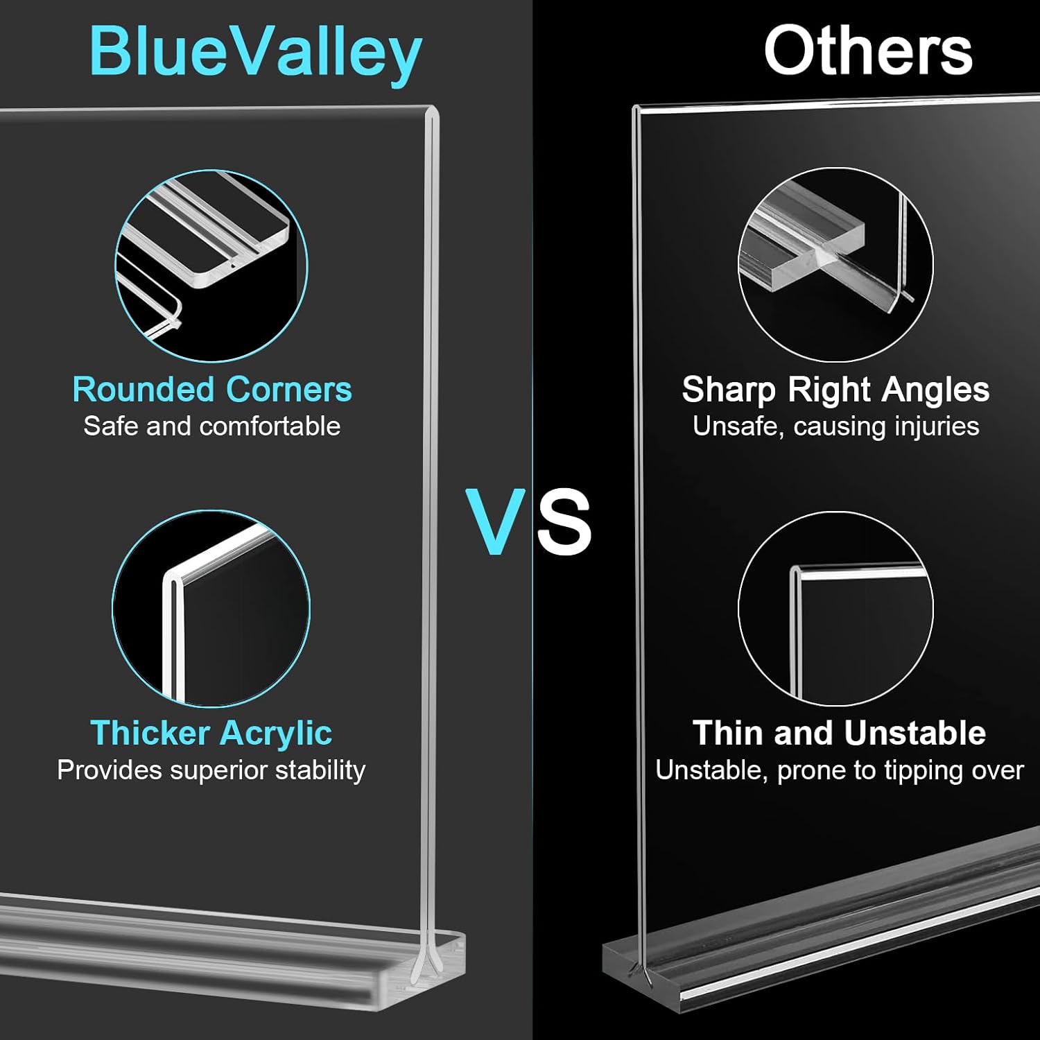 BlueValley Acrylic Sign Holder 5x7 Vertical – 12 Pack Double Sided Clear Plastic Display Stand for Table Menu, Flyer, Photo, Document – Standing Desktop Frame for Office, Retail, Home, Commercial Use