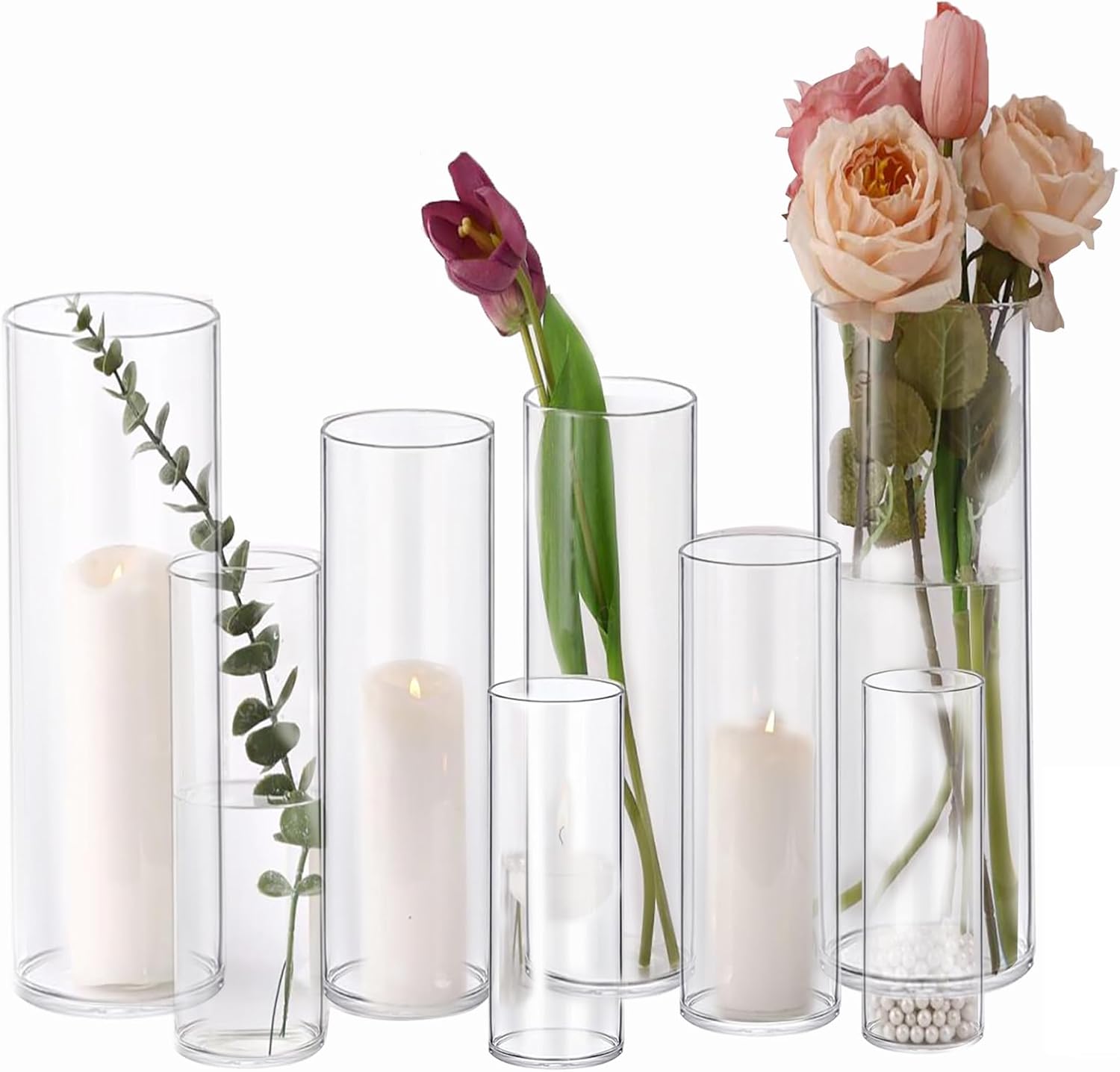 PHOSPHOR 8 PCS Glass Candle Holder, Hurricane Candle Hoder, Glass Pillar Candle Holder, Clear Cylinder Candleholder Cylinder Vase for Centerpieces Wedding Party Decoration