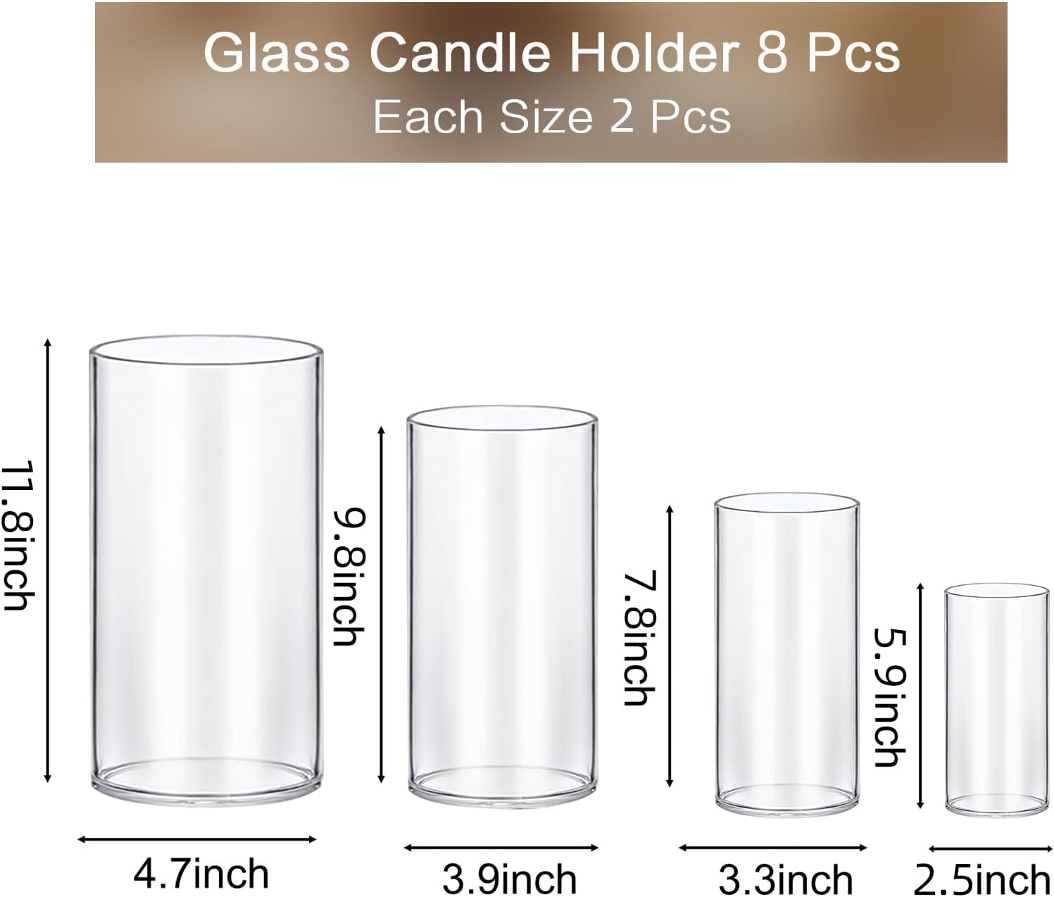 - 4 Different Sizes Candle Holder: The set glass candle holder includes 4 different size—Large Size: width 4.7'' x height 10'', Medium Size: width 3.9'' x height 7.8'', Small Size: width 3.3'' x height 5.9'', each size 2 pcs, It can be used as a pillar candle holder, floating candle holder, and vase for flowers, which is the ideal choice for modern home decoration