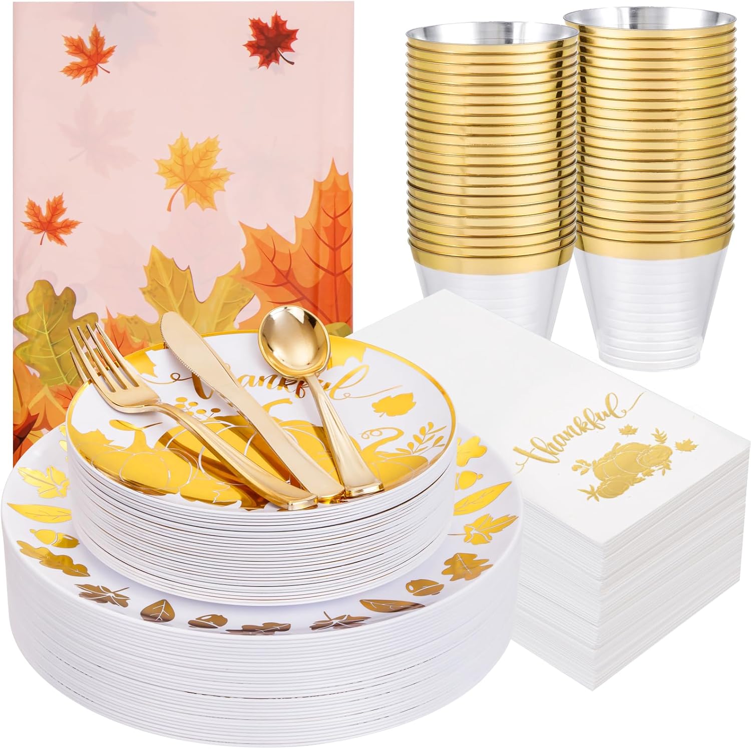 - VALUE SET :176 pcs thanksgiving dinnerware sets with 25 10.25" dinner plates, 25 7.5" salad plates, 25 pumpkin napkins, 25 9oz cups, 75 Silverware, and 1 fall tablecloth, providing your party or event with a complete dining solution