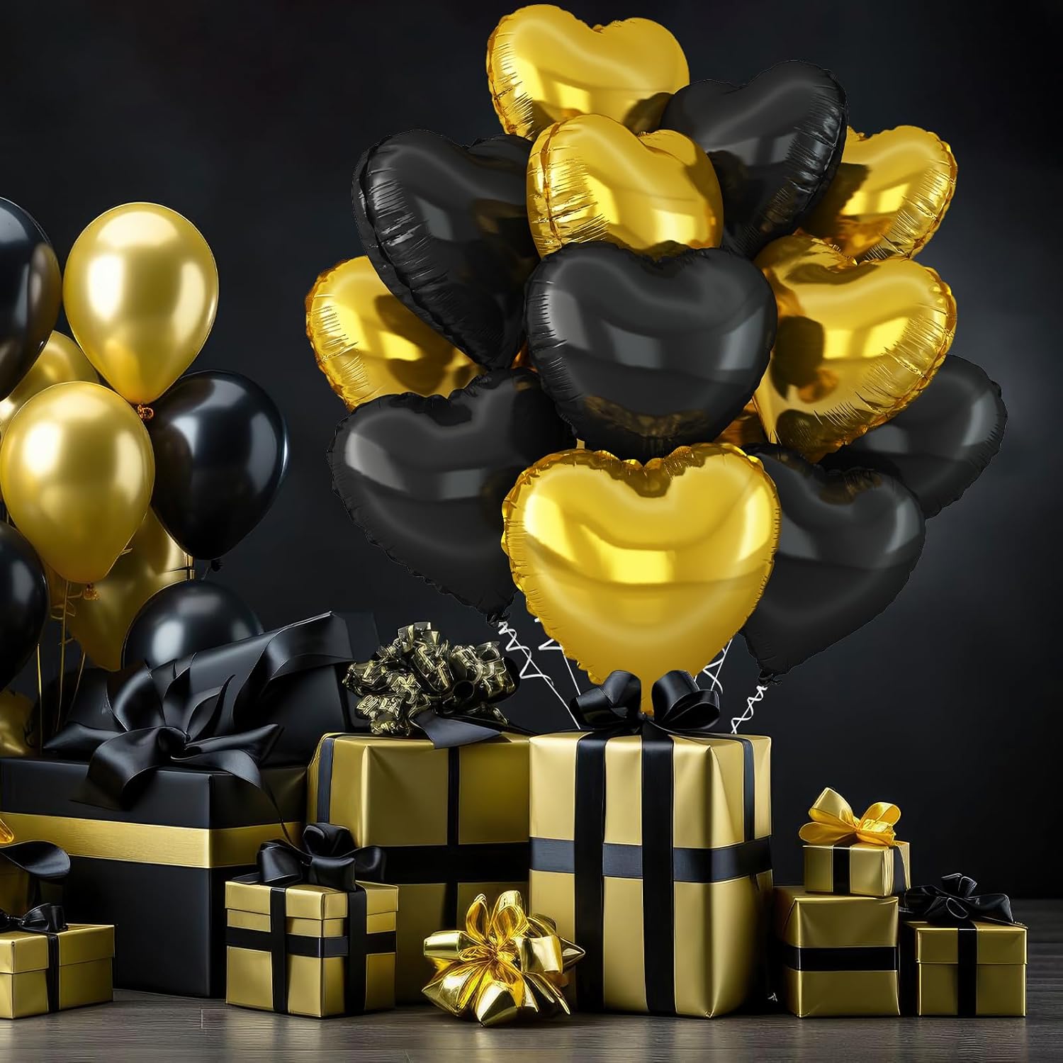 Black Gold Heart Balloons,12Pcs Black Heart Shaped Foil Balloons,18Inch Gold Helium Polyester Film Balloon for Baby Shower Birthday Anniversary Wedding Party Decorations