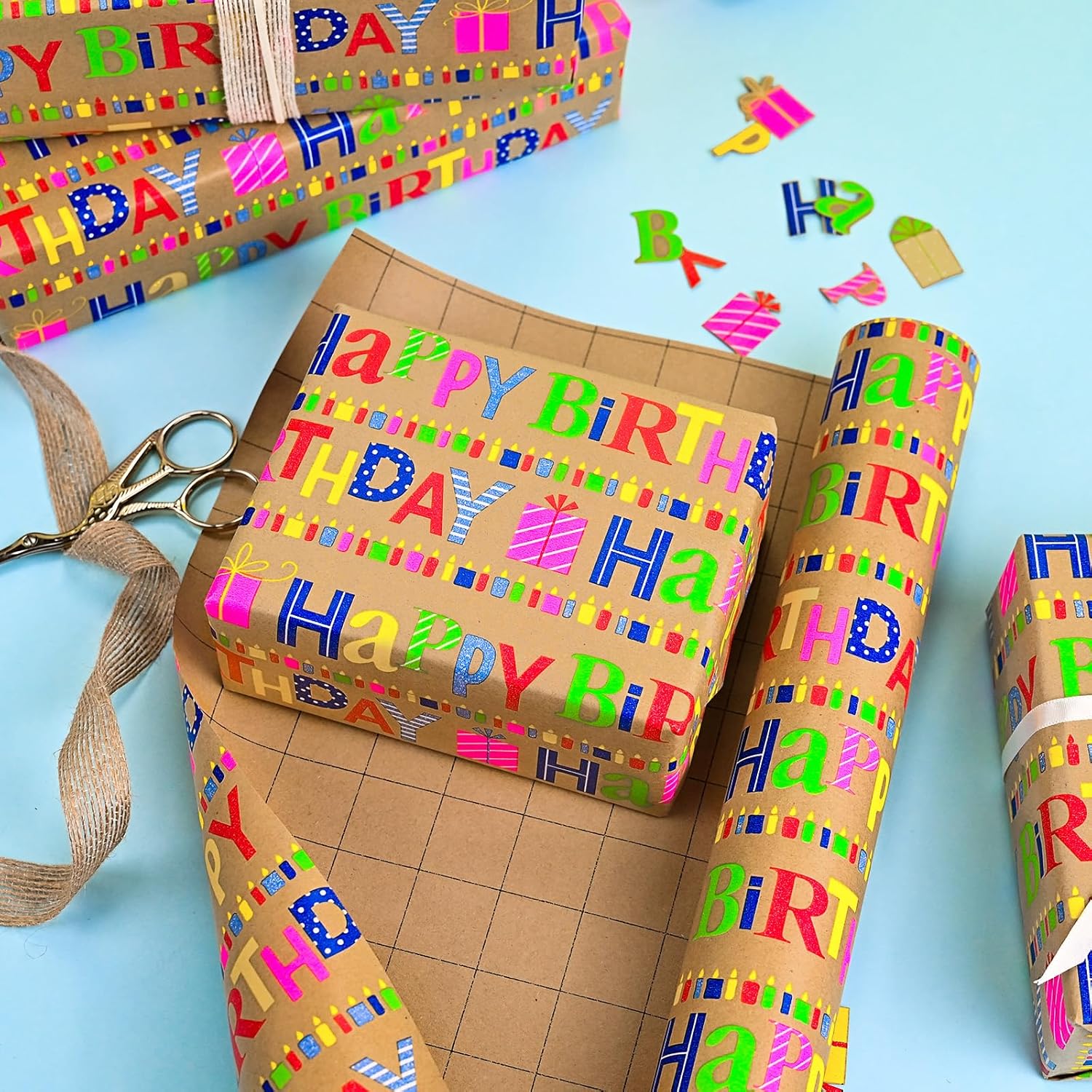 - BIRTHDAY KRAFT WRAPPING PAPER: Featuring vibrant happy birthday messages on a kraft-paper background, brighten up a birthday for a kid or kid-at-heart with this colorrful birthday wrapping paper.