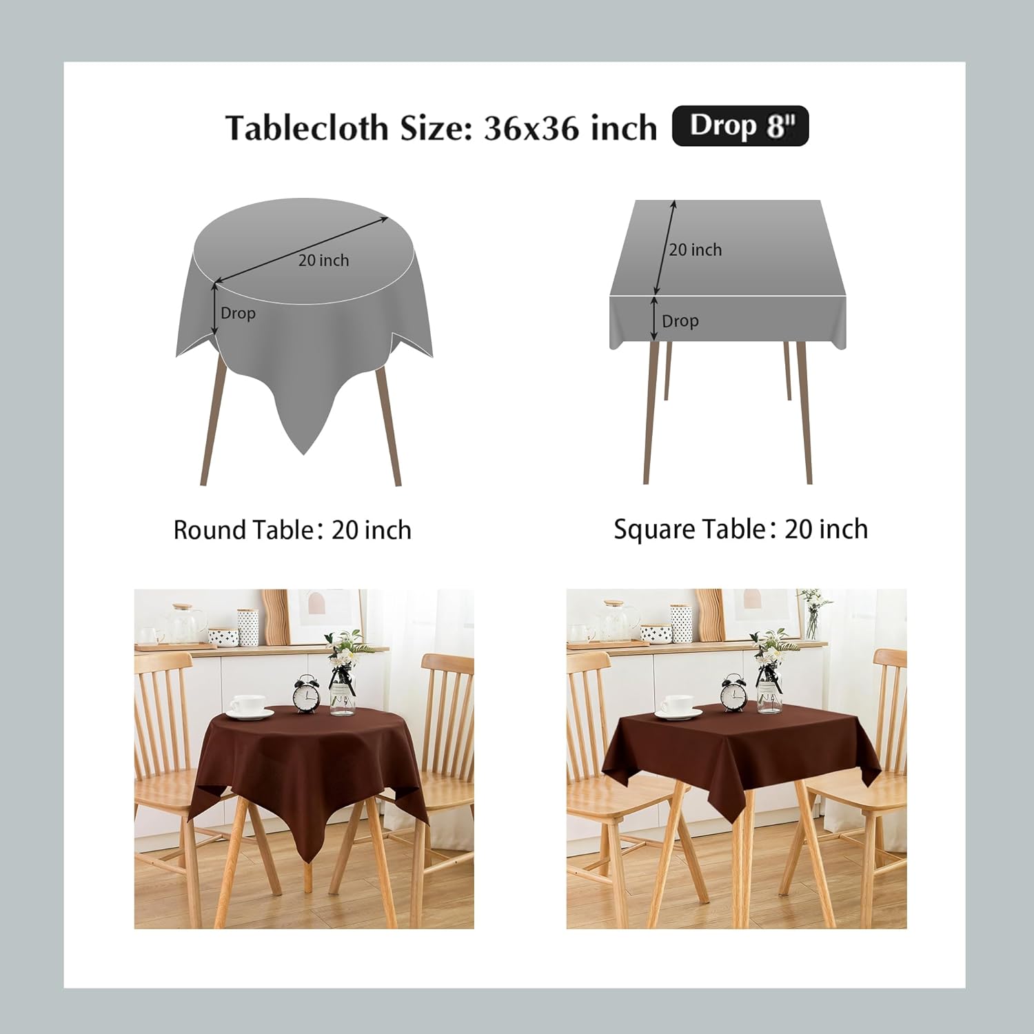 - Size Guide: Each package contains 2 PCS tablecloths. Each small square chocolate tablecloth is 36X36 inches, recommended for small square tables from 20 X 20 inches to 28 X 28 inches, such as end tables, coffee tables, tea tables, beside tables, foldable tables, nightstands, flower stands and so on, with a droop length about 4 inches to 8 inches. There may be a slight deviation due to manual tailoring
