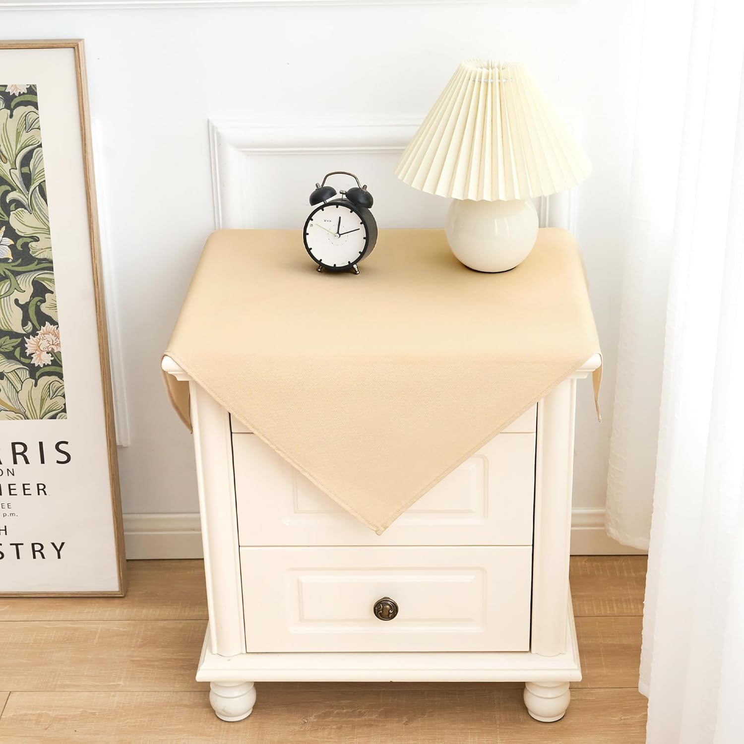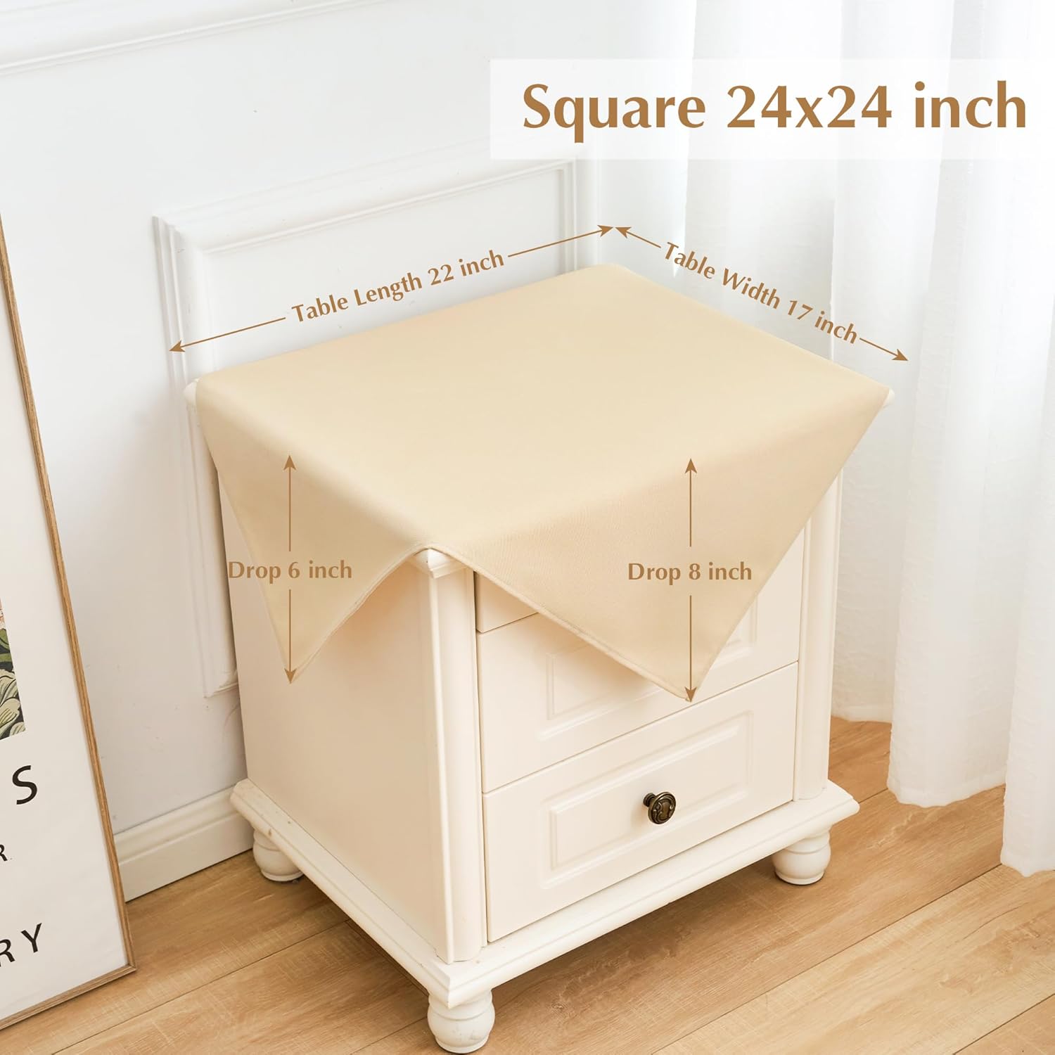 - Size Guide: Each package contains 2 PCS tablecloths. Each small square beige tablecloth is 24X24 inches, recommended for small square tables from 8 X 8 inches to 16 X 16 inches, such as end tables, coffee tables, tea tables, beside tables, foldable tables, nightstands, flower stands and so on, with a droop length about 4 inches to 8 inches. There may be a slight deviation due to manual tailoring