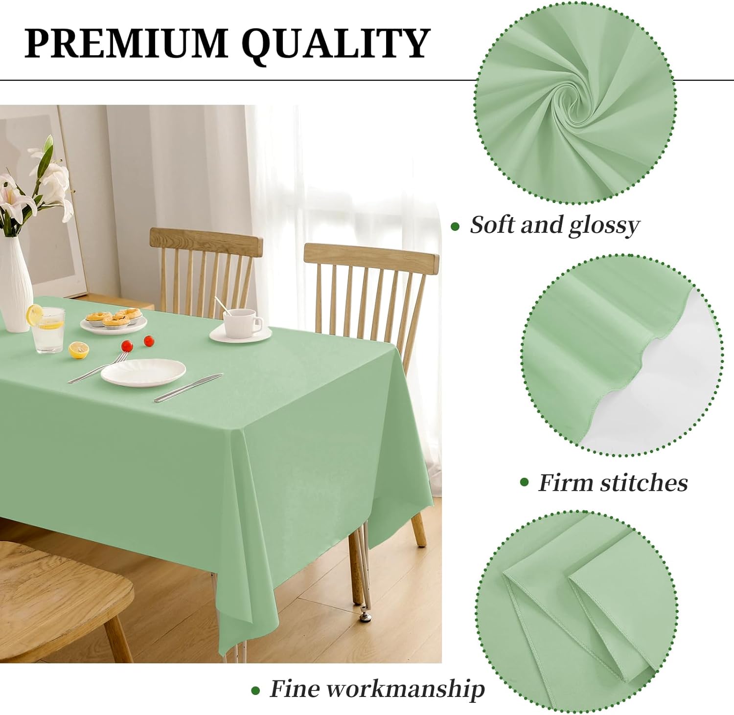 - 【Package Include】You will receive 12 packs of 60x126 Inch sage green rectangle polyester tablecloths, perfect for standard 8ft table, providing 15 inch drop. The product comes individually packaged in a re-sealable storage bag. Sage green tablecover is more luxurious, classic and gracious, ideal for both formal & casual settings and makes a great gift for all occasions. Protect your table from scratch,stains and sun rays while decorate your table. Quality of 12 packs is sufficient for your needs.