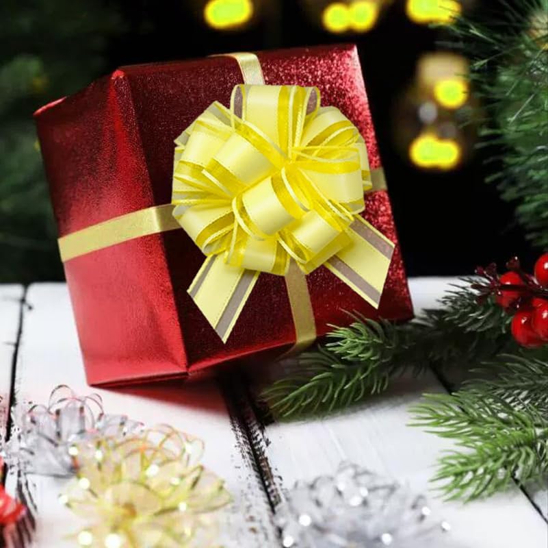 6 Pieces Large Pull Bows, 6 inches, Floral, Yellow, Organza, Wedding, Baby Shower, Bridal Shower, DECORATIVE RIBBON TRIM, 6 Count