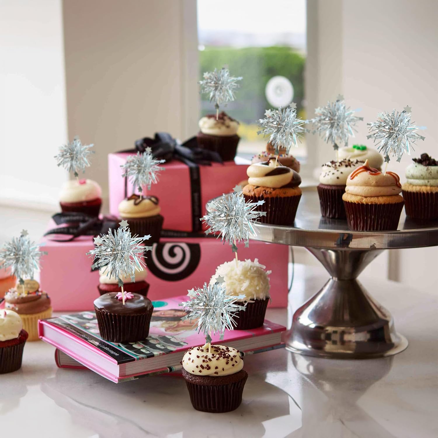 Gyufise 30Pcs Foil Firework Cupcake Toppers Sparkle Tinsel Star Cake Toppers Tinsel Drink Cake Decoration Cocktail Picks for Birthday Wedding Graduation Party Supplies Silver