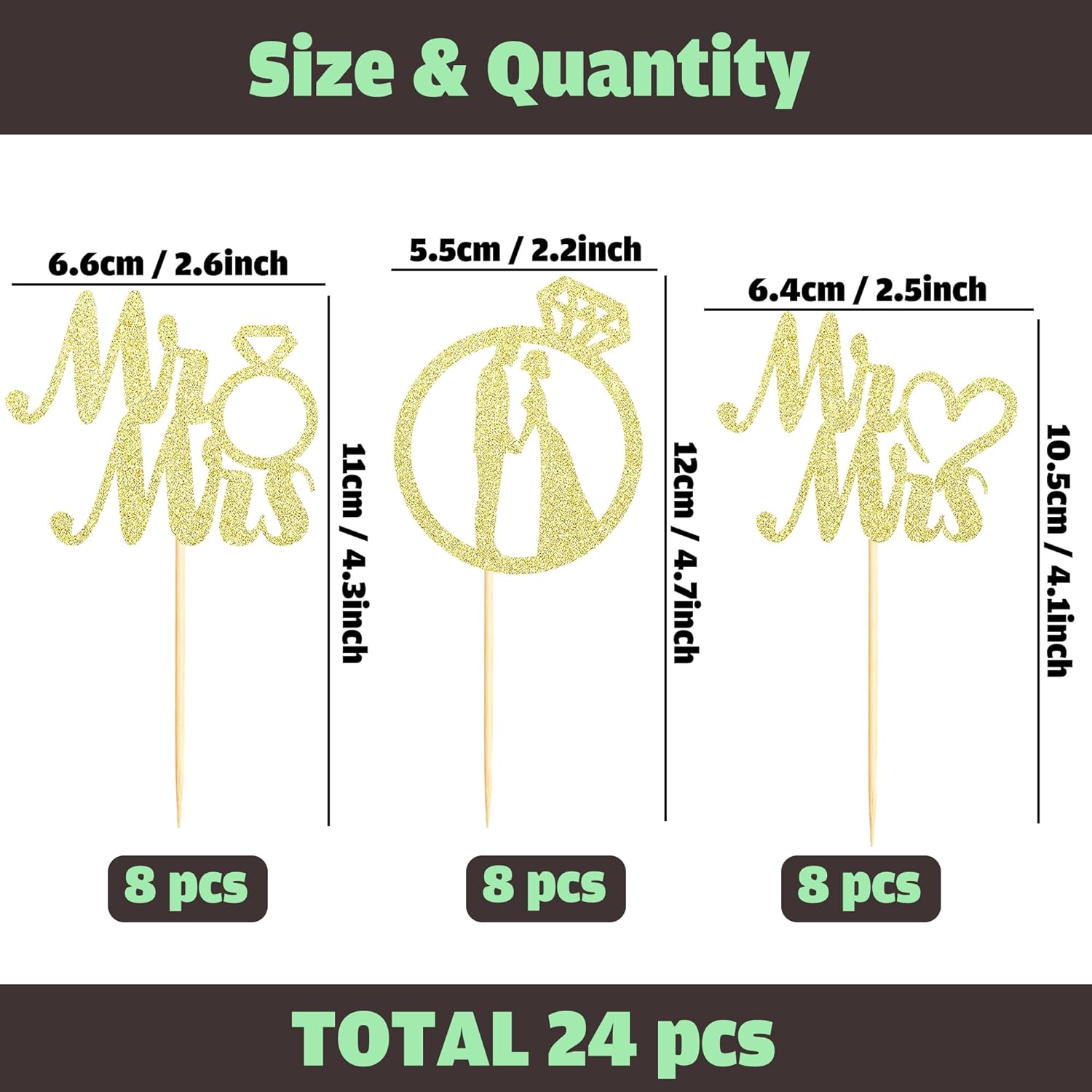 - Unique Design: This 24PCS Miss to Mrs Cupcake Toppers to make your Wedding Engagement party stand out! The delicate design like your a match made in heaven makes your dessert look more romantic. Shimmering glitterscreate a lovely and sweet feel for your wedding party