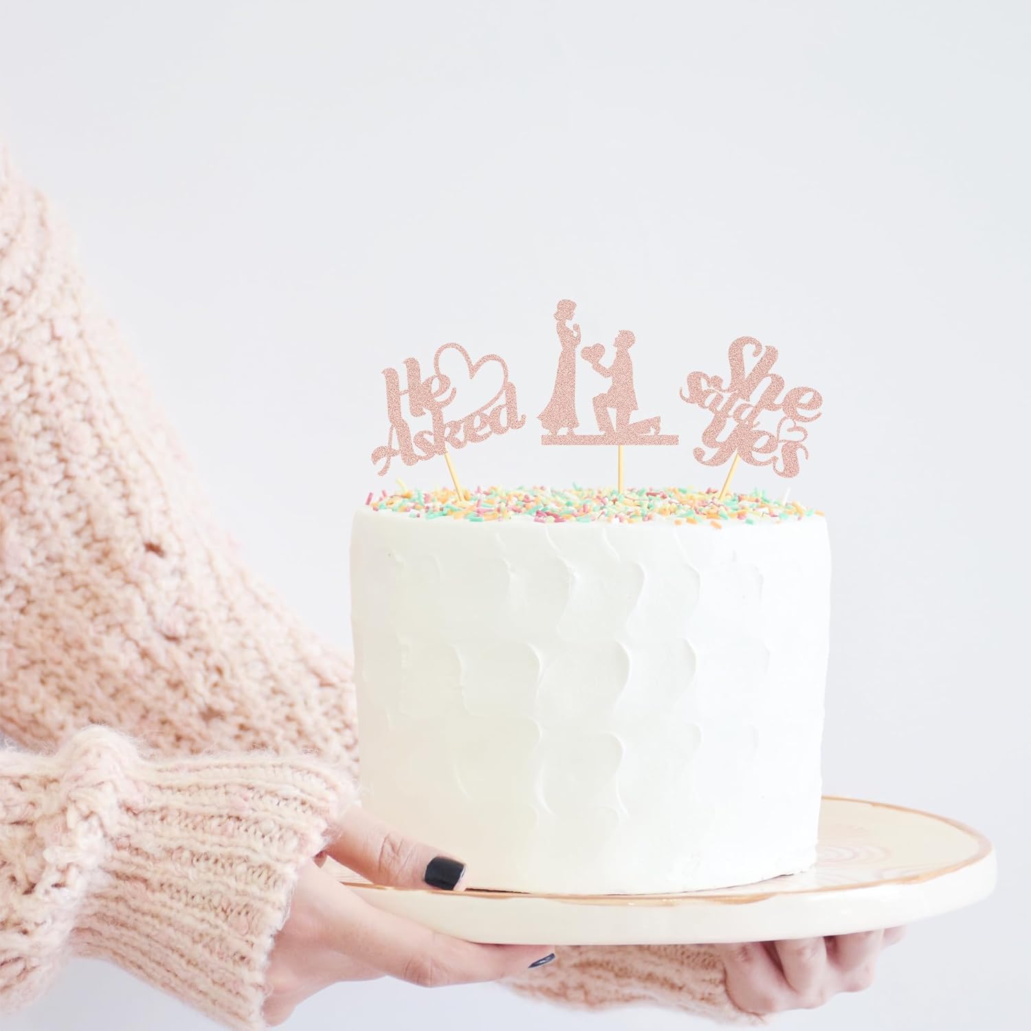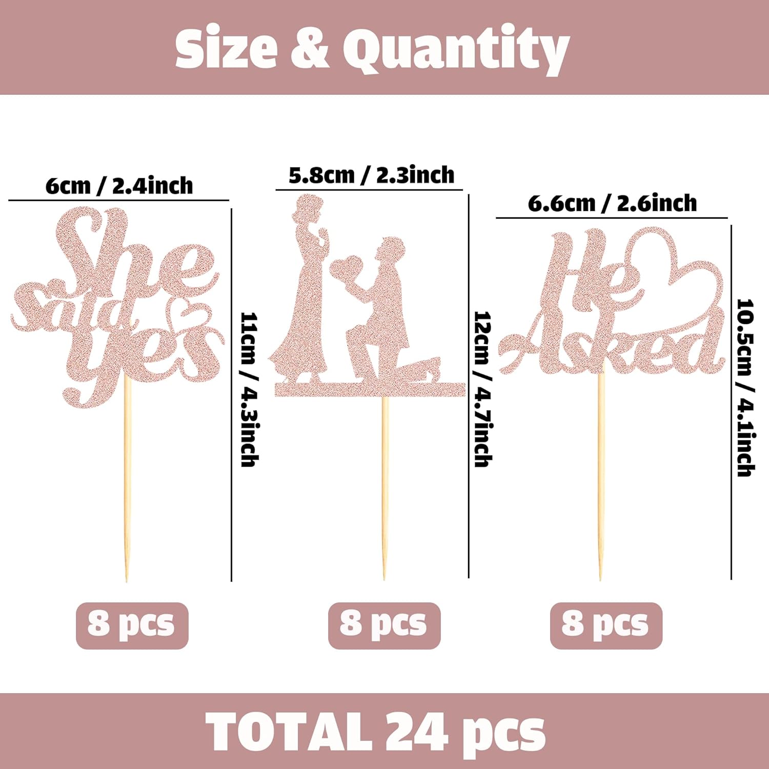 - Package Included: 3PCS Rose Gold Glitter He Asked She Said Yes Cupcake Toppers add "propose"sign. Already assembled so you can insert into wedding engagement party decoration, which make your cake icing on the cake. Size: W 2.3 inch * H 4.72 inch / W 6 cm * H 12 cm(Including Stick)