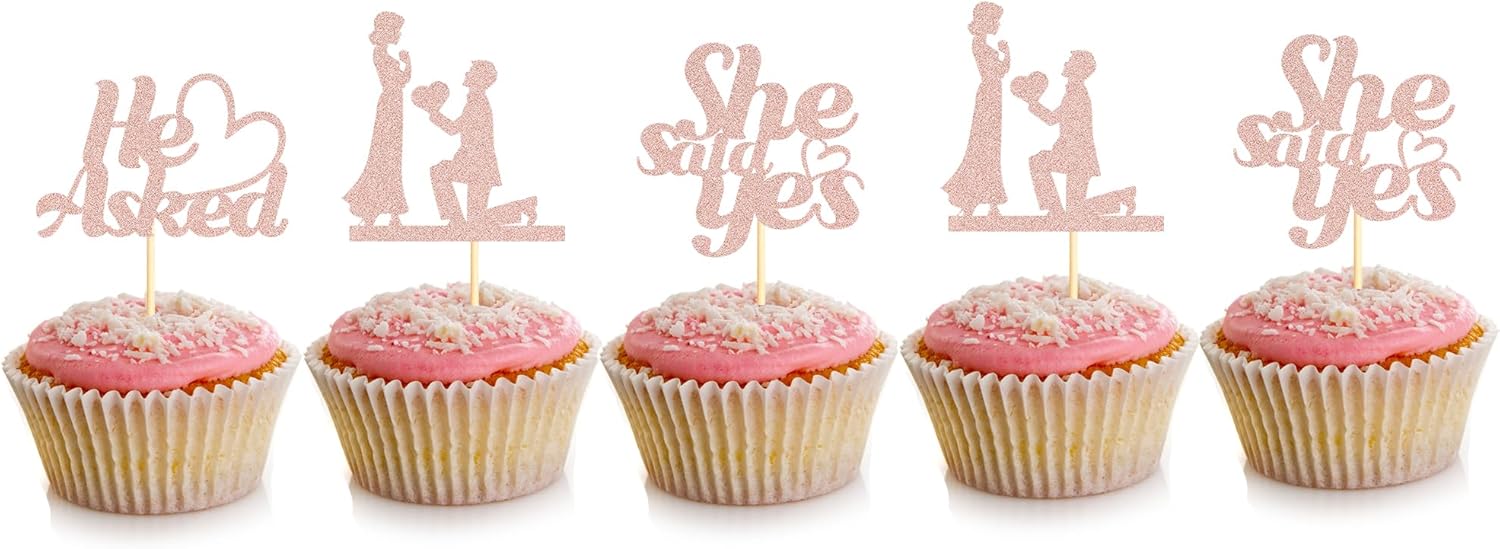 - Unique Design: This rose gold 24PCS He Asked She Said Yes Cupcake Toppers to make your Wedding Engagement party stand out! The delicate design like your a match made in heaven makes your dessert look more romantic. Shimmering glitterscreate a lovely and sweet feel for your wedding party