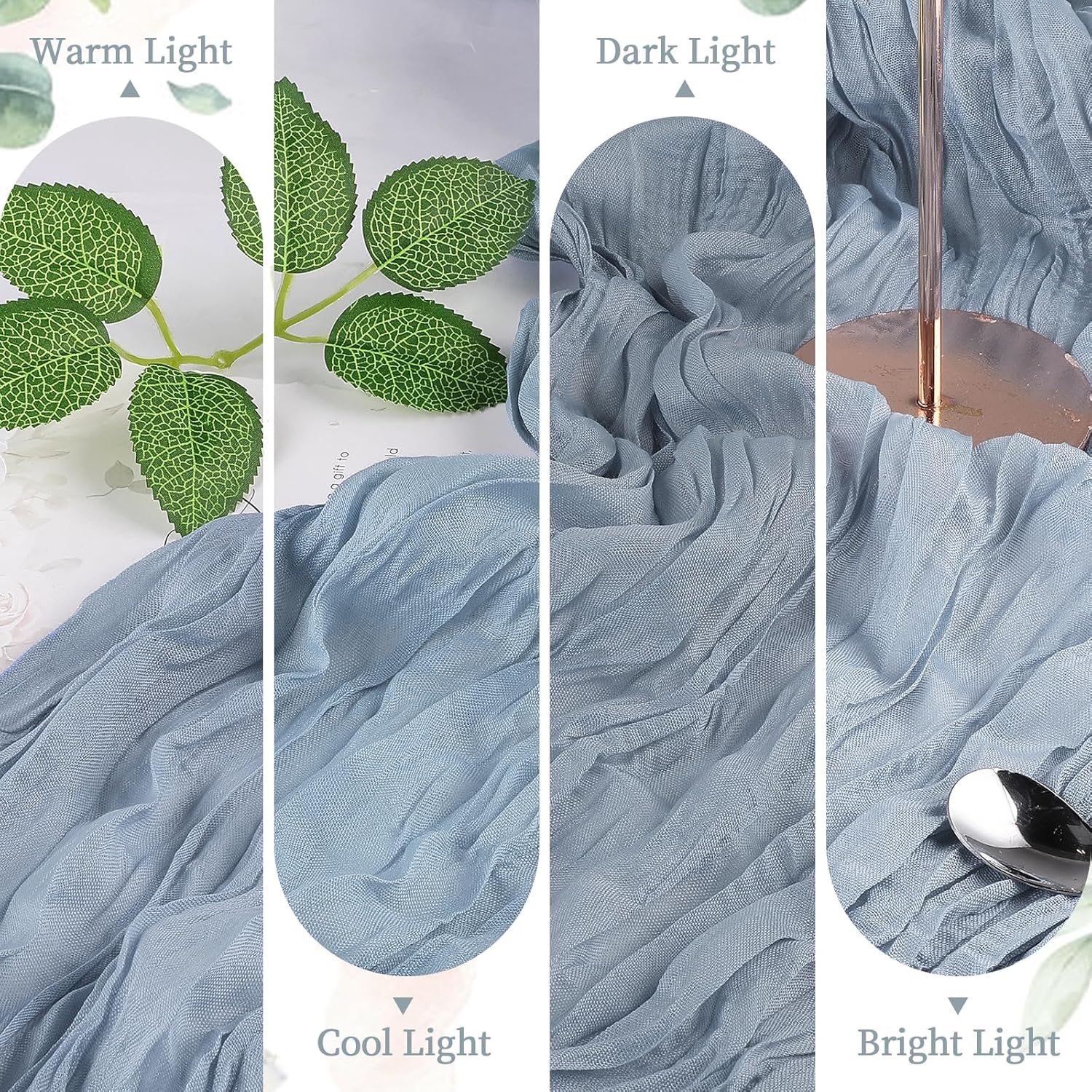 - PACKAGE INCLUDED: You will receive 6 pieces of dusty blue cheesecloth table runners. Elegant and beautiful design, exquisite workmanship. Product size: Each boho table runner is 35 x 120 inches. Enough to cover rectangles and round tables, as well as long tables that are stitched together. It can even be used to belt chairs decorate napkins, background curtains. Round or square tables for 8-10 people, perfect for romantic and elegant party events
