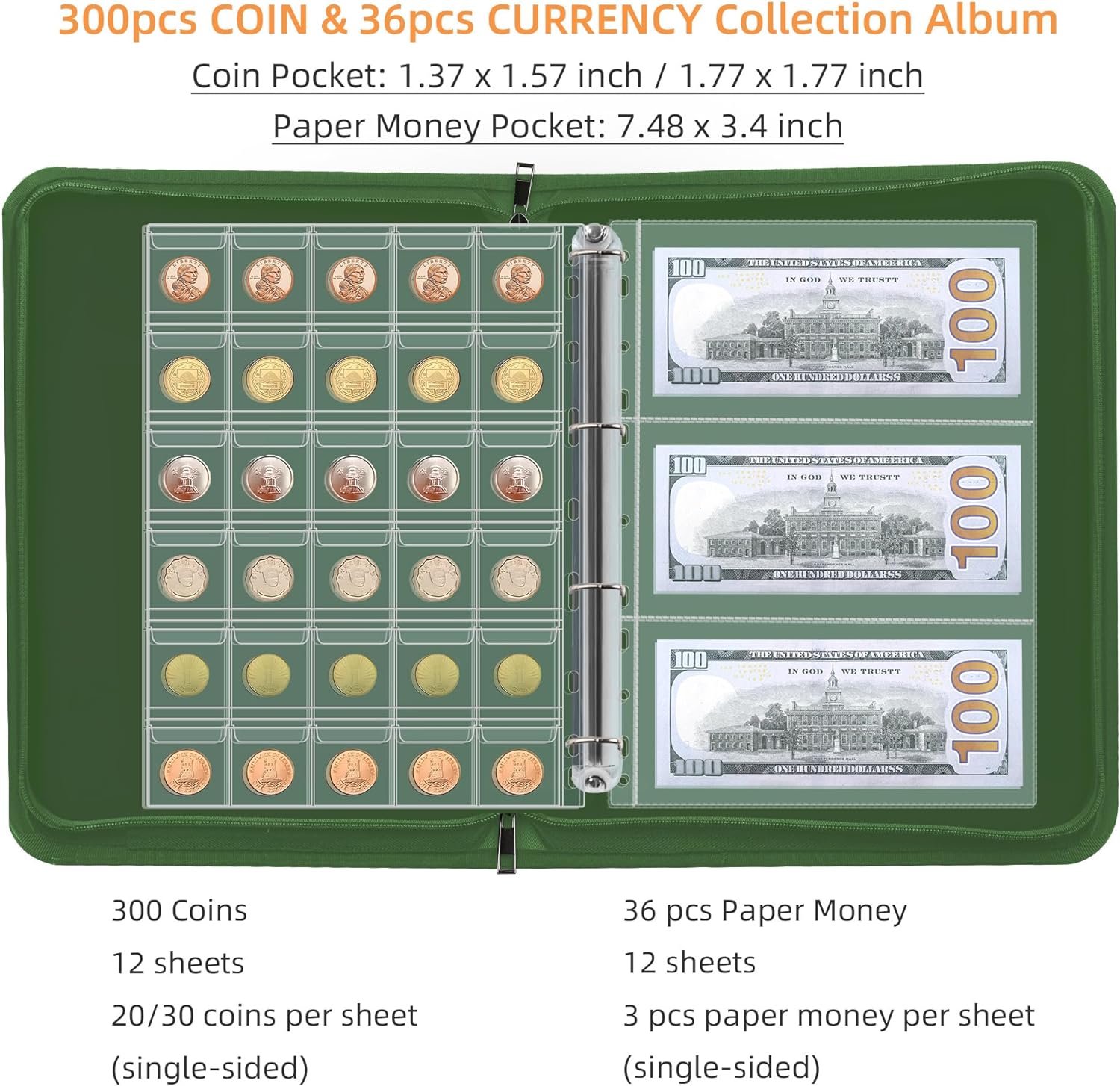 - Large Capacity for less than 45mm Coin and Currency:currency collection book has 12 pages plastic sheets for pennies, quarters, Silver Eagle, silver gold dollars, half dollars, silver bullion, challenge coins, and more coins(not exceed 45mm), 20 pockets per page total for over 120 coins and 30 pockets per page total for 180 coins , currency album comes with 12 page bill currency sleeves total 36 pockets for paper, money, stamp collecting supplies