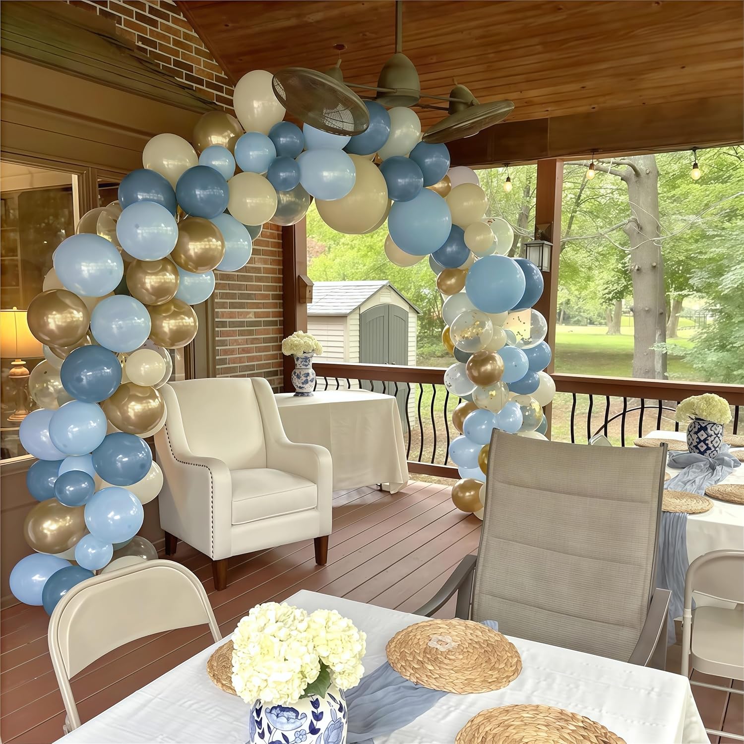 - 💙 Dusty Blue Balloons Set: This is a beautiful bright balloon, which contains balloons of different colors. Include 12 inch white sand balloon(15pcs), dusty blue balloon(15pcs), Slate Baby Blue balloon(15pcs), metallic champagne gold balloon(10pcs), gold confetti balloon(5pcs), 2 rolls of ribbons. You can use these different shades of blue balloon kits, DIY balloon combinations to create your birthday party.