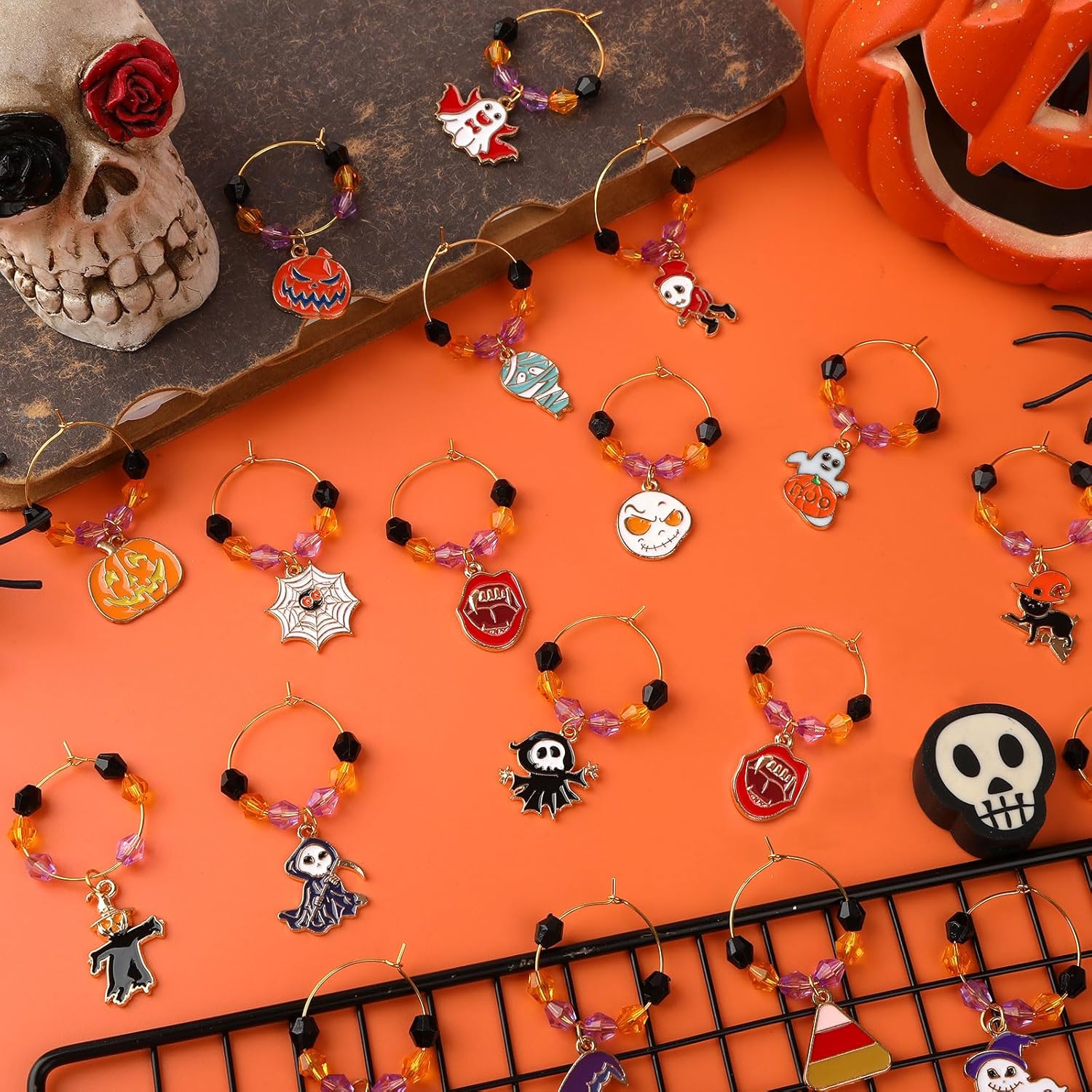 - Application Scenario: Halloween wine glass charms are widely used in Halloween parties, family gatherings, school activities, company activities and other occasions, and wine glass markers add more value and fun to the party. Whether wine tasting time or social occasion, Halloween wine charms will inject more excitement and fun into your wine tasting experience