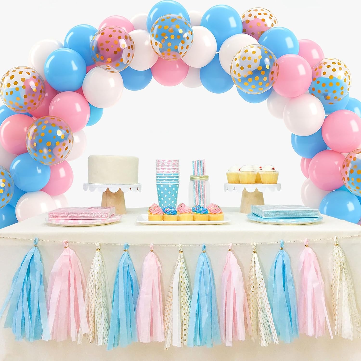 - Package Include: Our pink and blue balloons kit includes 15 pcs pastel blue balloons, 15 pcs macaron pink balloons, 10 pcs white balloons, 10 pcs gold confetti balloons, 1 pink ribbon and 1 blue ribbon