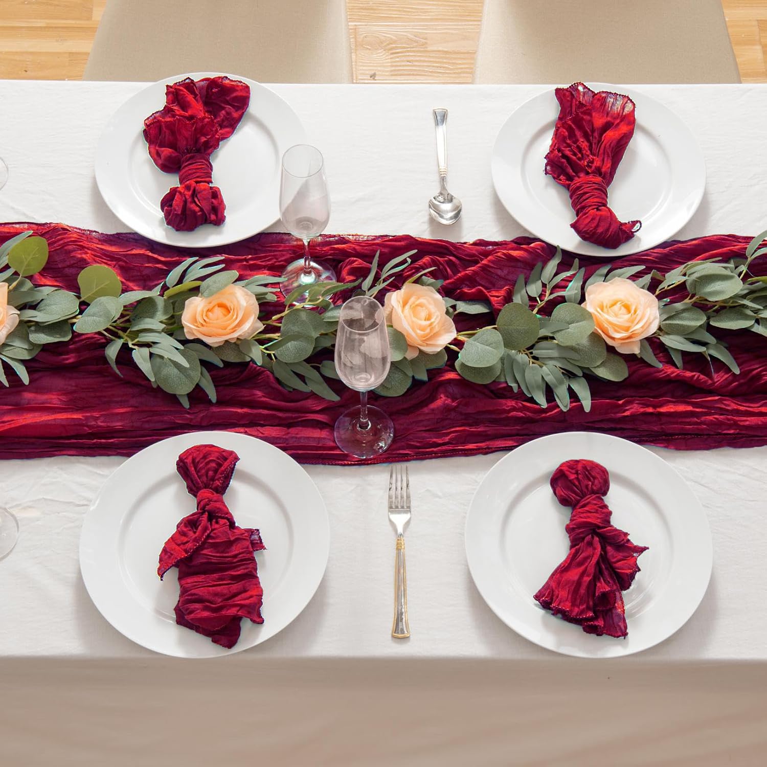 8 Pack 10Ft Table Runner 35x120 inch Burgundy Boho Gauze Table Cheese Cloth Long Wrinkled Sheer Table Runner for Wedding Bridal Shower Birthday Party Table Decor