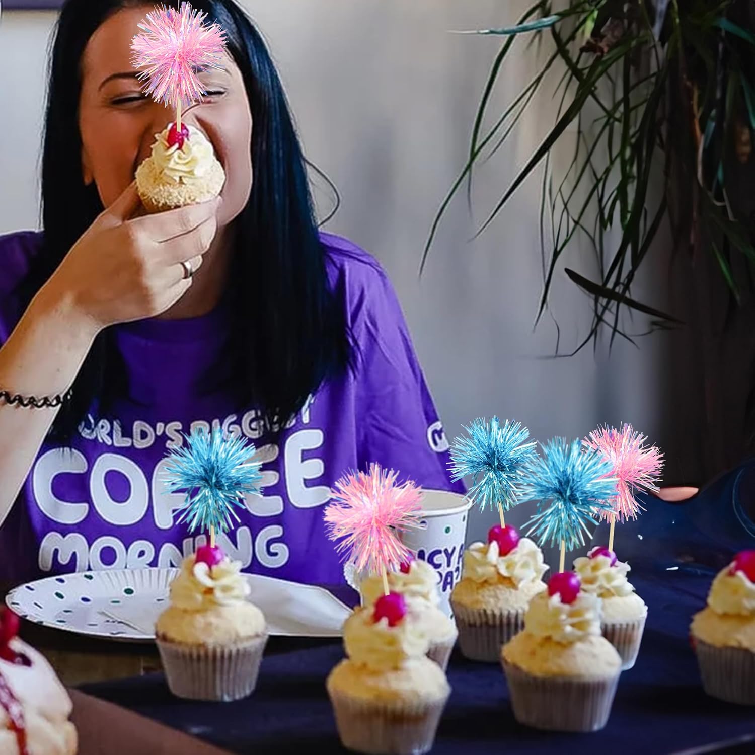 Gyufise 30Pcs Foil Firework Cupcake Toppers Sparkle Tinsel Cake Toppers Tinsel Drink Cake Decoration Cocktail Picks for Birthday Wedding Graduation Party Supplies Light Blue Pink