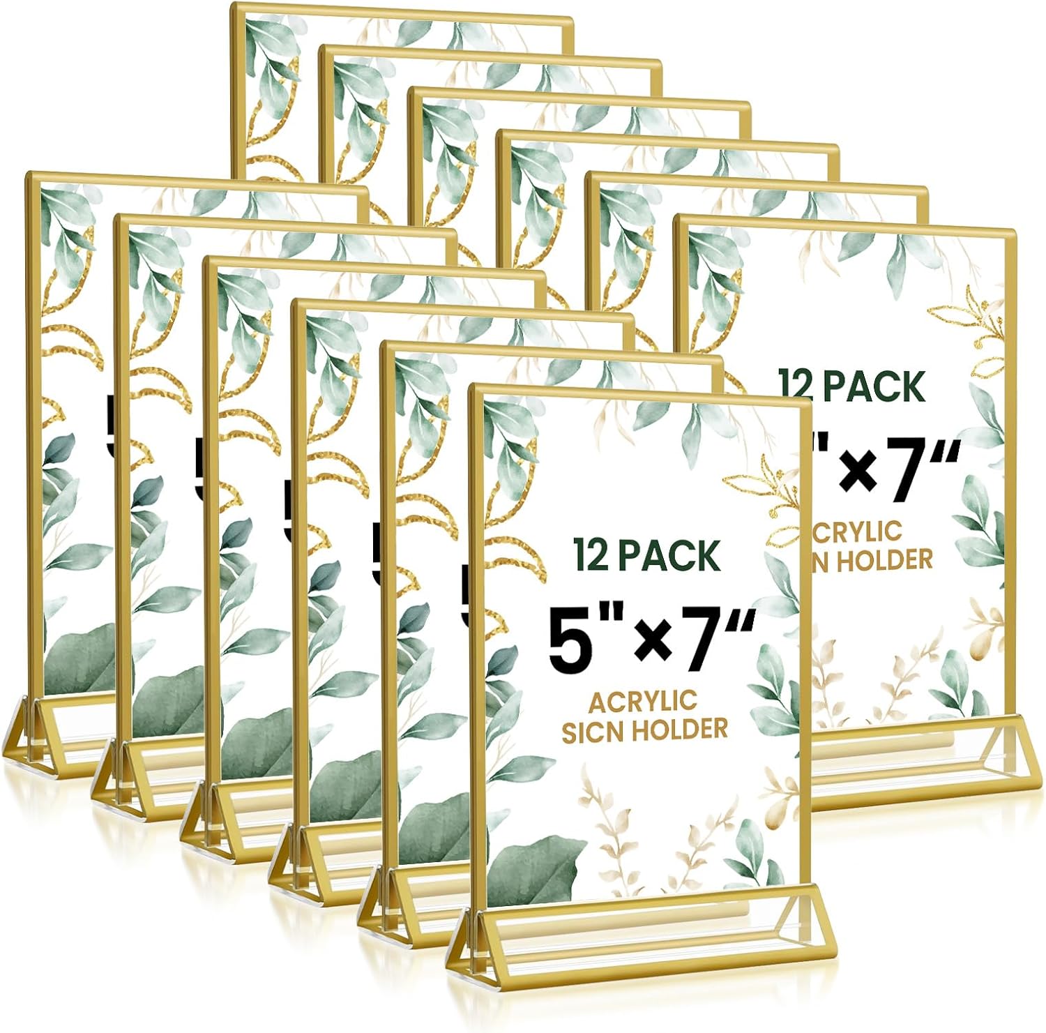 5x7 Gold Acrylic Sign Holder, 12 Pack Wedding Table Number Stands With Vertical Gold Borders, Double Sided Picture Frame Paper Stand, Clear Photo Display Menu for Party, Home, Restaurant